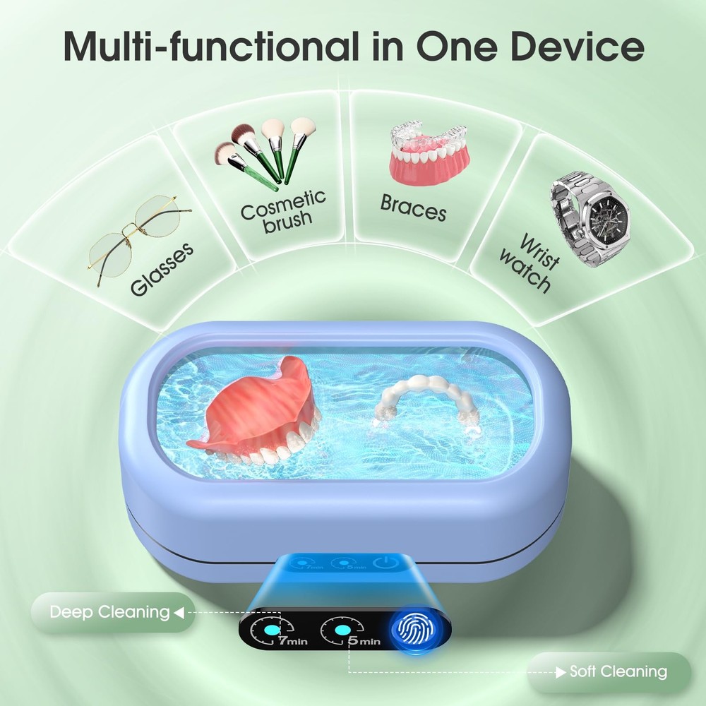 Professional Ultrasonic Jewelry Cleaner: Effortlessly cleans and restores the sparkle of jewelry, eyeglasses, watches, coins, and more by reaching into crevices and cavities to remove dirt and debris within minutes, all without causing damage. Note: This Jewelry Cleaner does not remove tarnish discoloration(using an ultrasonic cleaning solution is recommended) 2025 New Upgraded Dual-Core Ultrasonic Cleaner:This ultrasonic jewelry cleaner utilizes the latest dual-core ultrasonic frequency technology, generating millions of tiny bubbles to provide deep, non-invasive cleaning. It ensures thorough removal of contaminants like dirt, without damaging delicate surfaces. Durable and High-Performance Construction:Built with a corrosion-resistant 304-grade stainless steel tank and industrial-grade transducers, the ring cleaner guarantees durability, stability, and enhanced cleaning performance. The tank's seamless design prevents leaks and ensures extended service life. Versatile Applications: Emphasize the jewelry cleaner ultrasonic machine’s versatility for cleaning a wide range of items, including Jewelry,Glasses ,Ring, dental instruments, electronic parts, coins, and personal items, making it suitable for home, professional, or industrial use. Versatile Applications: Emphasize the jewelry cleaner ultrasonic machine’s versatility for cleaning a wide range of items, including Jewelry,Glasses ,Ring, dental instruments, electronic parts, coins, and personal items, making it suitable for home, professional, or industrial use. Package Contents: Ultrasonic jewelry cleaning machine*1, 1*watch stand, and 1*user manual. Ideal for cleaning jewelry, eyeglasses, watches, and other delicate items, it's a gift that combines utility with convenience for everyday use.