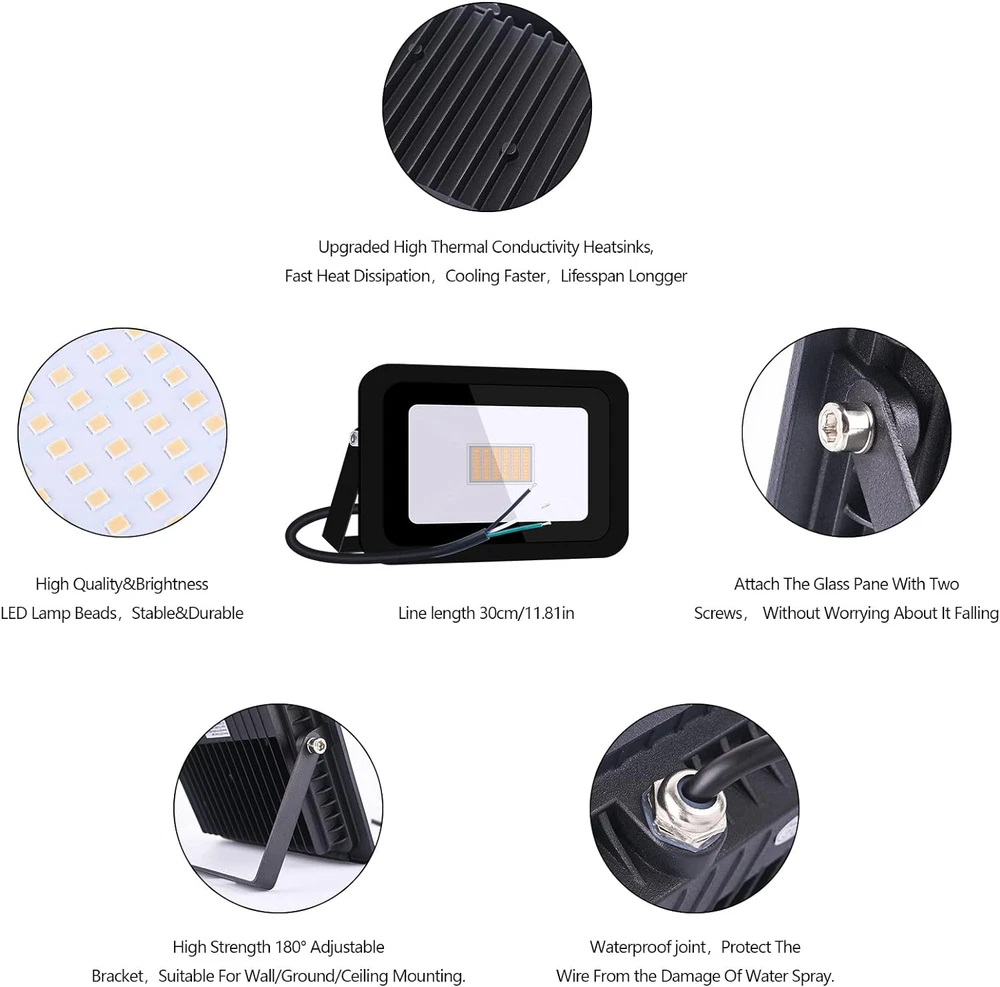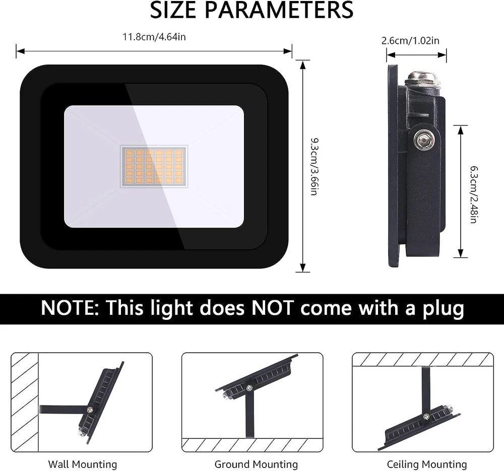 Country of Origin: China Wattage: 30 watts Plug Format: A- US style Number of Light Sources: 1 Special Features: Energy Efficient, Not Dimmable Finish Type: Unfinished" or "Aluminum Included Components: 1pcs led flood light Power Source: AC Room Type: Garage Batteries Required?: No Product Dimensions: 4.9"L x 1.3"W x 3.8"H Voltage: 110 Volts Water Resistance Level: Waterproof Shape: Rectangular or Square Lighting Method: LED Bulb Base: Wedge gtin13: 7445003221275 Specific Uses For Product: Fence Assembly Required: No Material: Aluminum Style: Modern Special Feature: Energy Efficient, Not Dimmable Size: 30W Type: Does not apply Installation Type: Ground Mount Finish: Unfinished" or "Aluminum Recommended Uses For Product: outdoor indoor Efficiency: High Efficiency UPC: 7445003221275 Fixture Type: Non Removable Indoor/Outdoor Usage: Outdoor, Indoor Control Method: App Light Color: Warm White Brightness: 2300 Lumen Mounting Type: Wall Mount Shade Color: White Number of Items: 1 Theme: Music Item Weight: 6.4 ounces Unit Count: 1 Count Batteries Included?: No Warranty Type: 2 year Light fixture form: Floodlight Light Source Type: LED Color: Warm White Warranty Description: 3years. Brand: Does not apply