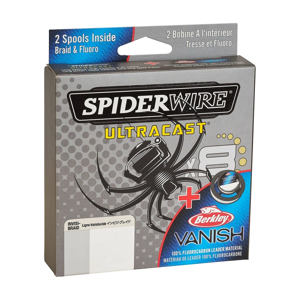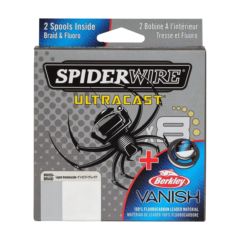 All the benefits of braided fishing line conveniently matched with fluorocarbon for an invisible presentation! Ultracast Braid paired with Berkley Vanish Fluorocarbon offers strength and toughness for all fishing applications with the invisibility near the bait triggering more strikes. This dual spool pack offers ultimate casting distance, strength, low visibility, and incredible reliability in one. Suitable for saltwater and freshwater marine environments where stealth, durability, and reliability is key to your success. Throughout the years, has become the cutting-edge fishing line of choice for aggressive anglers who demand the most out of their gear. Our fishing line takes you where the fish are and makes sure you bring them home; with , nothing gets away. ULTRACAST BRAID matched with Berkley Vanish Fluorocarbon leader combining the benefits of braided line plus invisible presentation for all fishing applications. Includes 2 spools in one box. ULTIMATE STRENGTH AND INVISIBILITY: The strength of braided fishing line paired with 100% fluorocarbon to provide invisibility near the bait to trigger more strikes. MAXIMUM ABRASION RESISTANCE: Ultracast long casting braid built to withstand unpredictable fishing environments and reduce line breakage. Fishing line break strength of 15lb | 6.8kg. Braid Length: 164yd | 150m. Translucent. SMOOTH, EFFORTLESS CASTING: Clear Berkley 100% fluorocarbon line is stronger, smoother, and more flexible for easy casting. Clear for near invisibility. HIGH SENSITIVITY, LOW STRETCH: Diameter of 0.005in | 0.12mm offers strong lure action you can feel. Superline Mono Equiv: 6lb. Available in a variety of sizes and colors, so nothing gets away.