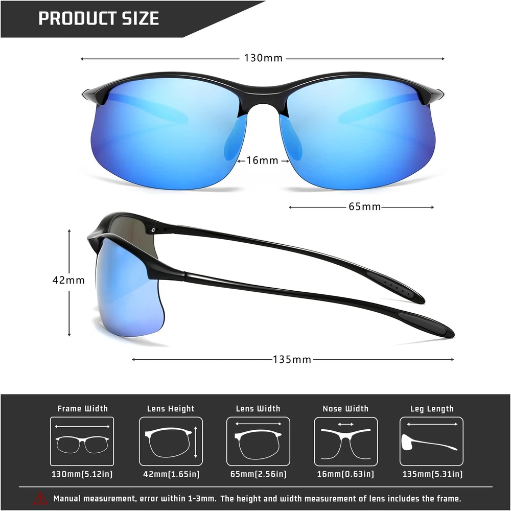 Experience next-level comfort with our performance sunglasses, crafted from premium TR90 material. This ultra-lightweight frame (just 12.7g!) combines featherlight flexibility with exceptional durability, featuring a sleek minimalist design that moves seamlessly with your face for zero pressure during sports, outdoor adventures, or all-day wear. Optically sharp polarized lenses deliver 100% UV400 protection and cutting-edge glare reduction for crystal-clear vision on the water, course, trail, and road. The wrap-around rimless design ensures 180° panoramic vision with no-slip security. Precision-engineered to fit most faces (130mm frame width), it comes in premium gift-ready packaging including cloth, pouch, and tools. Backed by our Premium Support Pledge: satisfaction guaranteed with 12-hour response commitment. TR90 Ultra-Lightweight Frame (Only 12.7g!): Engineered for active lifestyles, its featherlight yet durable TR90 material and slim, minimal design move seamlessly with your face—delivering zero pressure, modern style, and unmatched comfort for sports, outdoor adventures, and all-day wear. HD Polarized Lens: 100% UV400 protection with glare reduction,ideal for fishing running golfing biking Wrap-Around Rimless Design: Prevents light leakage, no-slip design with 180° clear vision Real Service Everyday Moments: Premium packaging, fast support within 12 hours, satisfaction guaranteed - perfect for everyday use or as a gift for someone who values comfort and quality Packed with Care Sized to Fit: Exquisite package includes cloth, pouch, mini screwdriver and box; frame width 130mm, lens height 42mm, lens width 65mm designed to fit most faces