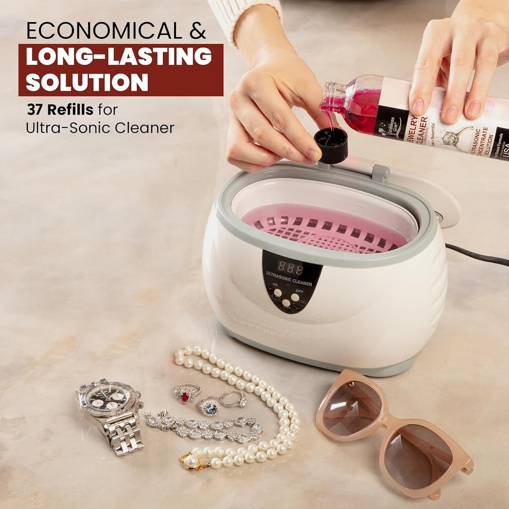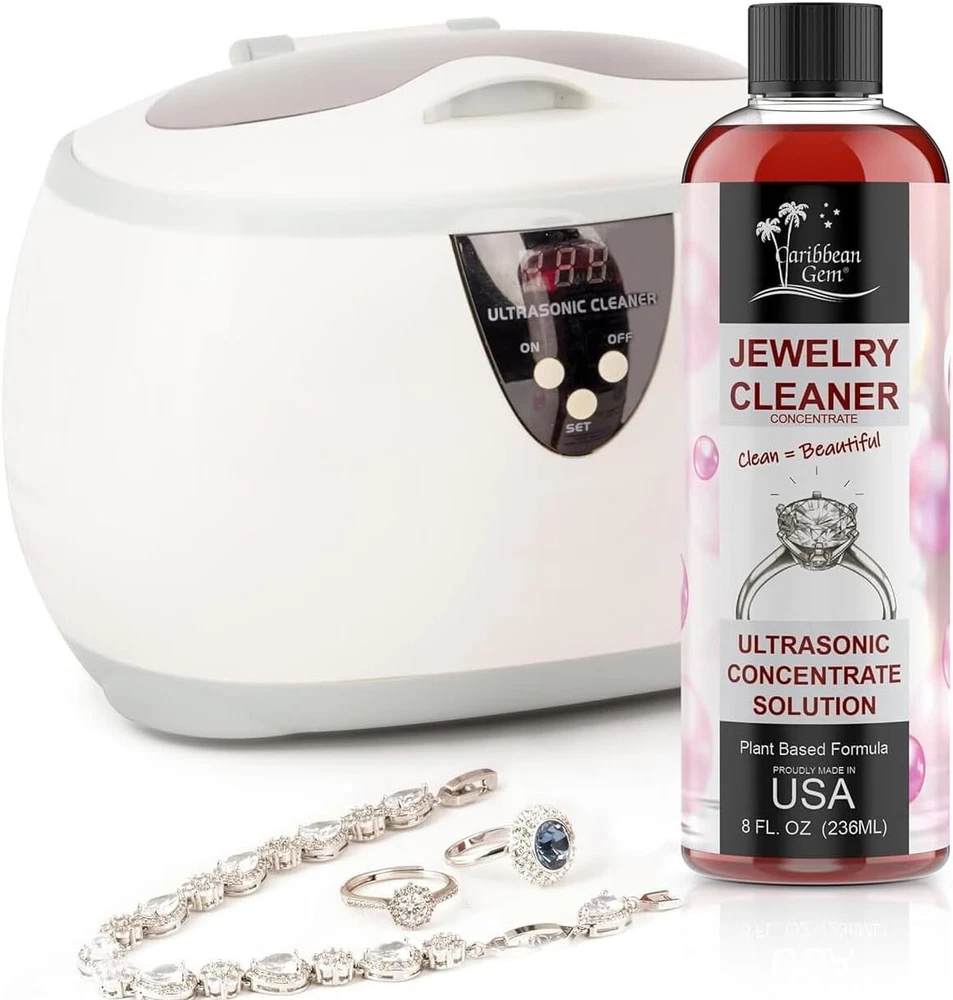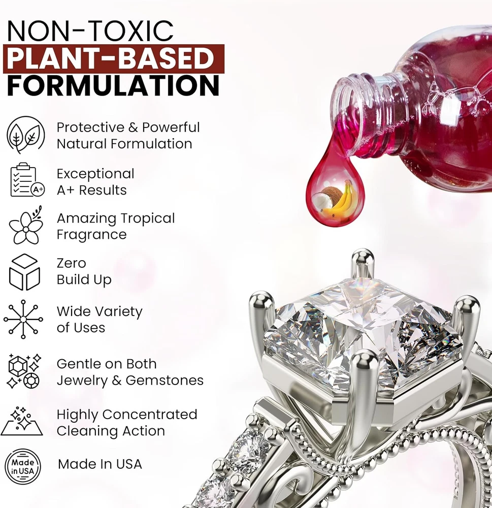 ๐ ๐๐๐ฃ๐ฎ๐ฏ๐๐ง๐๐ญ๐ข๐ง๐ ๐๐ฉ๐ ๐๐จ๐ซ ๐๐๐ฐ๐๐ฅ๐ซ๐ข๐๐ฌ - Rediscover the brilliance of your treasures with our USA-made ultrasonic jewelry cleaner liquid! With two 8 oz bottle, it delivers up to 37 machine refills for a long-lasting and cost-effective solution ๐๐๐ญ ๐๐๐๐๐ฒ ๐๐จ๐ซ ๐๐ก๐ข๐ง๐ข๐ง๐ ๐๐ซ๐ข๐ฅ๐ฅ๐ข๐๐ง๐๐ - Bathe your treasures in blissful luxury! From glittering gems to dazzling watches, our non-abrasive plant-based jewelry cleaning solution for ultrasonic cleaner is excellent for all your lovely jewels. ๐๐๐๐ข๐๐ข๐๐ง๐ญ ๐๐ฉ๐๐ซ๐ค๐ฅ๐๐ฌ - Simply pour one cap full of our ultrasonic cleaning solution per 20 ounces of water to turn your ultrasonic machine into a basin of sparkling elixir. One basin last for multiple cleanings. For non-machine use, a soft brush works wonders. ๐ ๐๐๐ซ๐ข๐๐๐๐๐ง ๐๐จ๐ฎ๐๐ก - Our ultrasonic jewelry cleaning solution is infused with Caribbean essence to bring you a touch of exotic delight. The notes of banana and coconut oil create a hygienic oasis, removing dirt and preventing the growth of harmful microorganisms. ๐๐ข๐ฆ๐ฉ๐ฅ๐ ๐๐ญ๐๐ฉ๐ฌ ๐ญ๐จ ๐๐ฎ๐ฌ๐ญ๐ซ๐จ๐ฎ๐ฌ ๐๐ก๐ข๐ง๐๐ฌ - The jewelry & ring cleaner solution comes with crystal-clear instructions, ensuring you can easily and efficiently apply our solution. It might not be magic, but it sure cleans like it!
