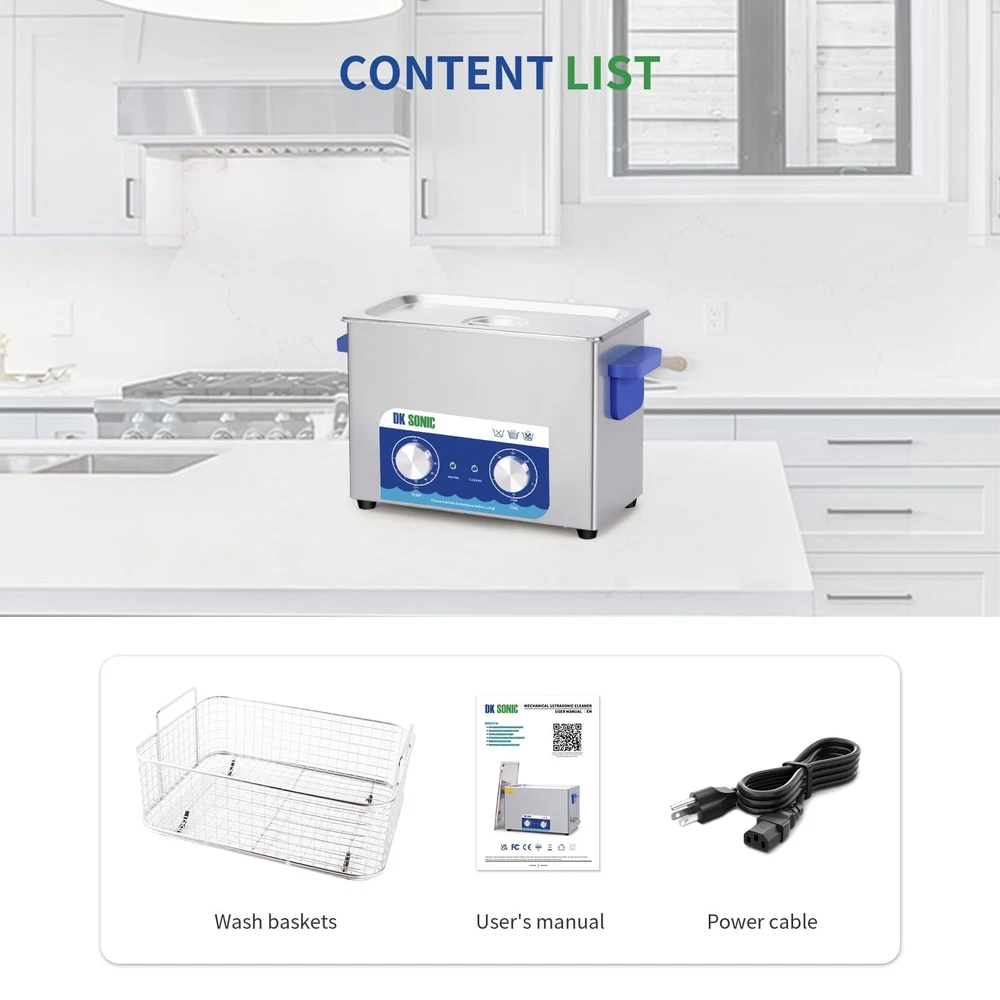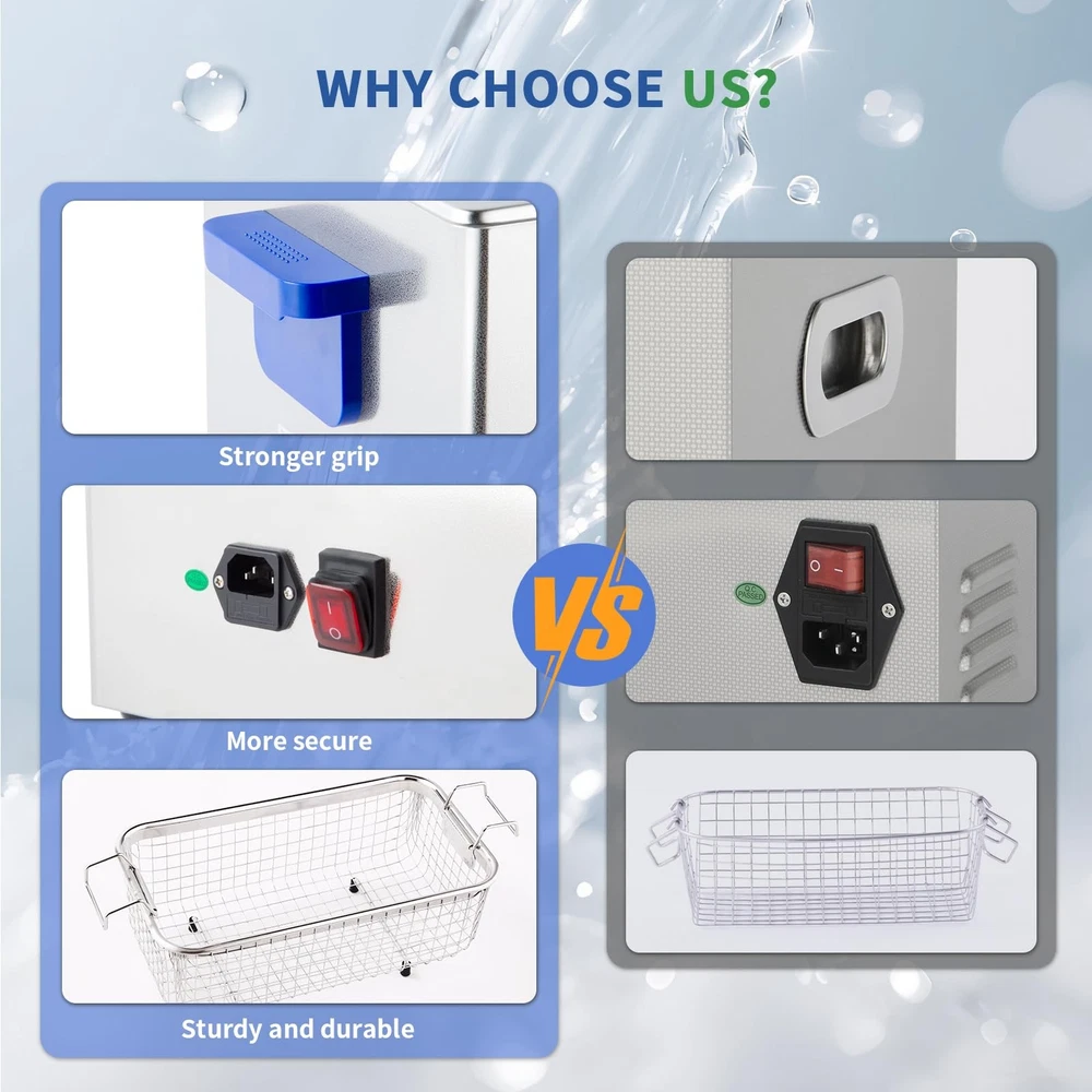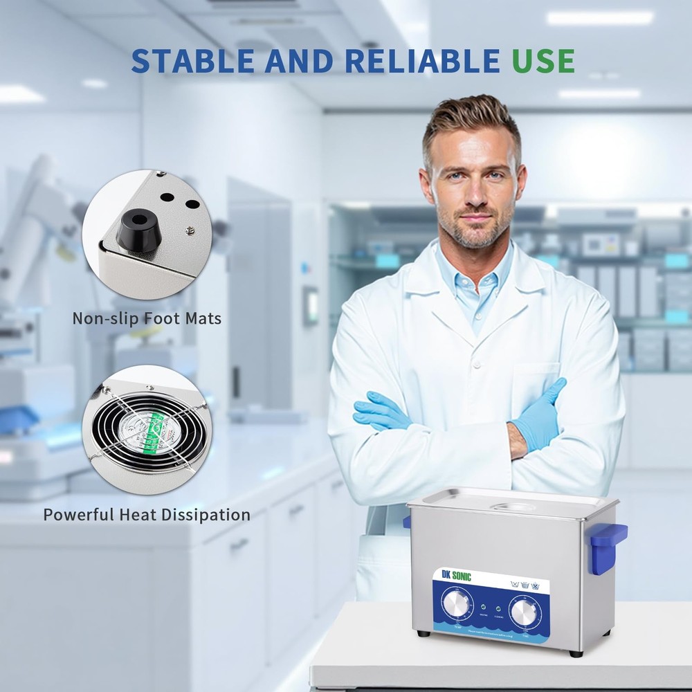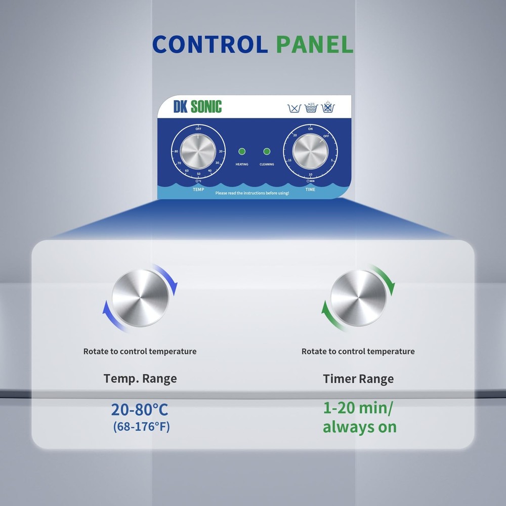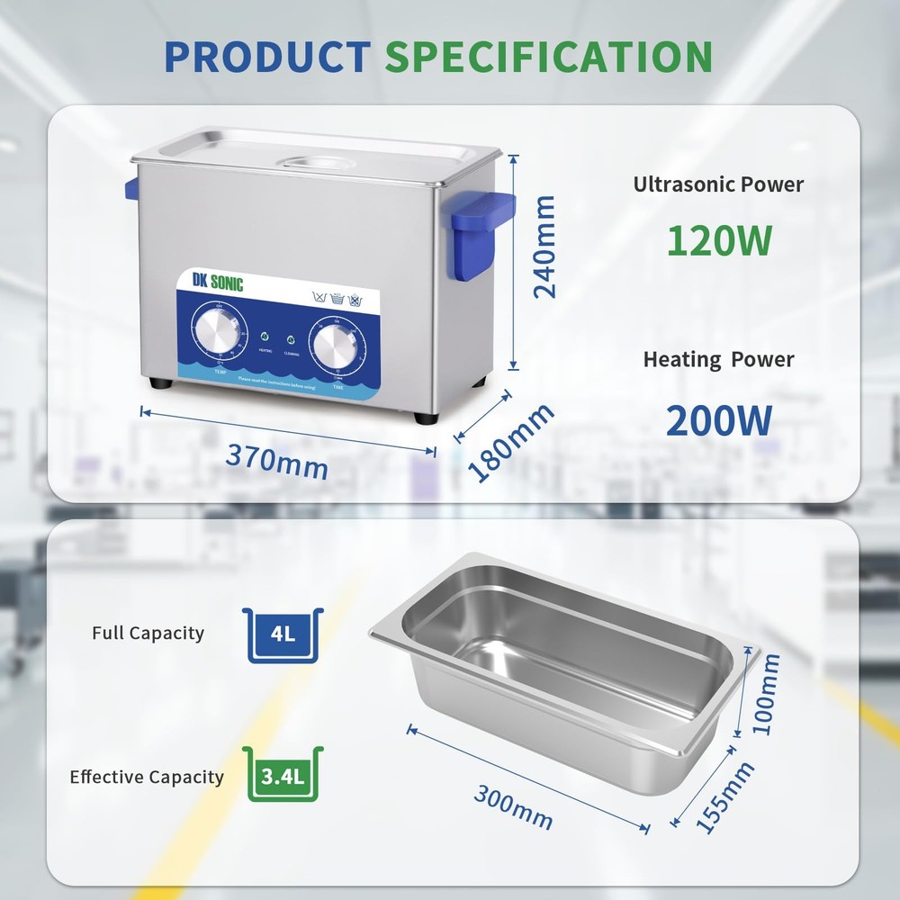 is a professional manufacturer of ultrasonic cleaners and has focused on the R&D of ultrasonic cleaners for more than 10 years. always bears in mind the "quality first, credit first" principle and tries to provide perfect products and great after-sales service. Specifications Tank Material: Stainless Steel SUS304 Heating Power: 200W Ultrasonic Power: 120W Frequency: 40kHz Power Supply: AC110V/60Hz Tank Capacity: 4L Time Setting: 1~20 Minutes or Always ON (LED Digital Display) Temperature Setting: Temp Settings within 0~80℃ Transducer Quantity: 2 sets Tank Size (L x W x H): 300*152*100 mm/11.8*6*3.9 in Product Size (L x W x H): 330*180*240 mm/13*7.09*9.45 in Package Contents 1 x Ultrasonic Cleaner 1 x Cleaning Basket 1 x Stainless Steel Cover 1 x Power Supply 1 x Instruction Manual 40KHz Ultrasonic Frequence for Intensive Rinse: 40KHz ultrasonic frequency can be used to clean stuffs with complicated surfaces, such as blind holes and deep holes etc. Die-casting SUS304 Stainless Steel Tank: The inner cleaning tank of the devices is made with SUS304 stainless steel materials, and it makes the device be resistant to weak acid and weak alkali. User-friendly Control Panel with Simple Mechanical Controllers: The devices are equiped with two simple mechanical industrial controllers which have a long service life and make the devices be operated easily. Always ON or Free time setting among 1~20 minutes: Extensive time-setting range makes the device be freely set to work for any certain time based on the characters of the stuffs to be cleaned. 20~80°C Heating Range for Degreasing and Dewaxing: Heating function is helpful for reducing the adhesion strength of oil and wax so as to improve the cleaning effect, and generally the best cleaning temperature is among 40~60°C, i.e. 104~140°F.