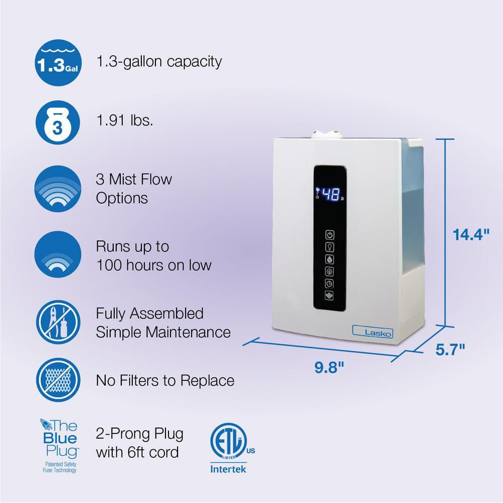 EAN: 046013738516 Brand: Lasko Item Weight: 5 lb Number of Speeds: 3 gtin13: 046013738516 Model: UH300 Humidification Method: Ultrasonic Color: White Timer Control: 12 hrs MPN: UH300 Coverage: More Than 215 sq ft Item Height: 14.37 in Features: Digital Display, Quiet Operation, Automatic Shut Off, Humidistat, LED Lights Type: Mini UPC: 046013738516 Item Width: 5.71 in Power Source: Electrical