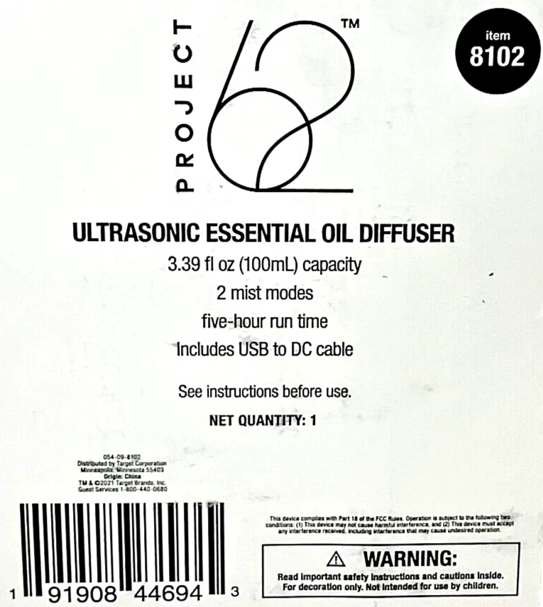 Project 62 Ultrasonic Narrow Form Essential Oil Diffuser 3.39 fl oz - 4.96" x 2.81" x 5.88"D. Includes USB to DC Cable. 100ml Essential oil diffuser for your living spaces Neutral design mixes easily with your existing decor 5 hour run time for long-lasting enjoyment AC adapter powered for versatile use and placement Continuous and intermittent mist modes with auto shutoff Condition is New - Free Standard Shipping.