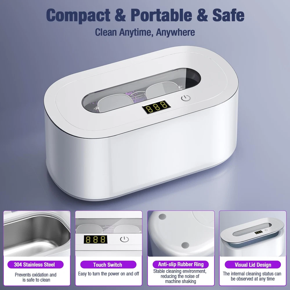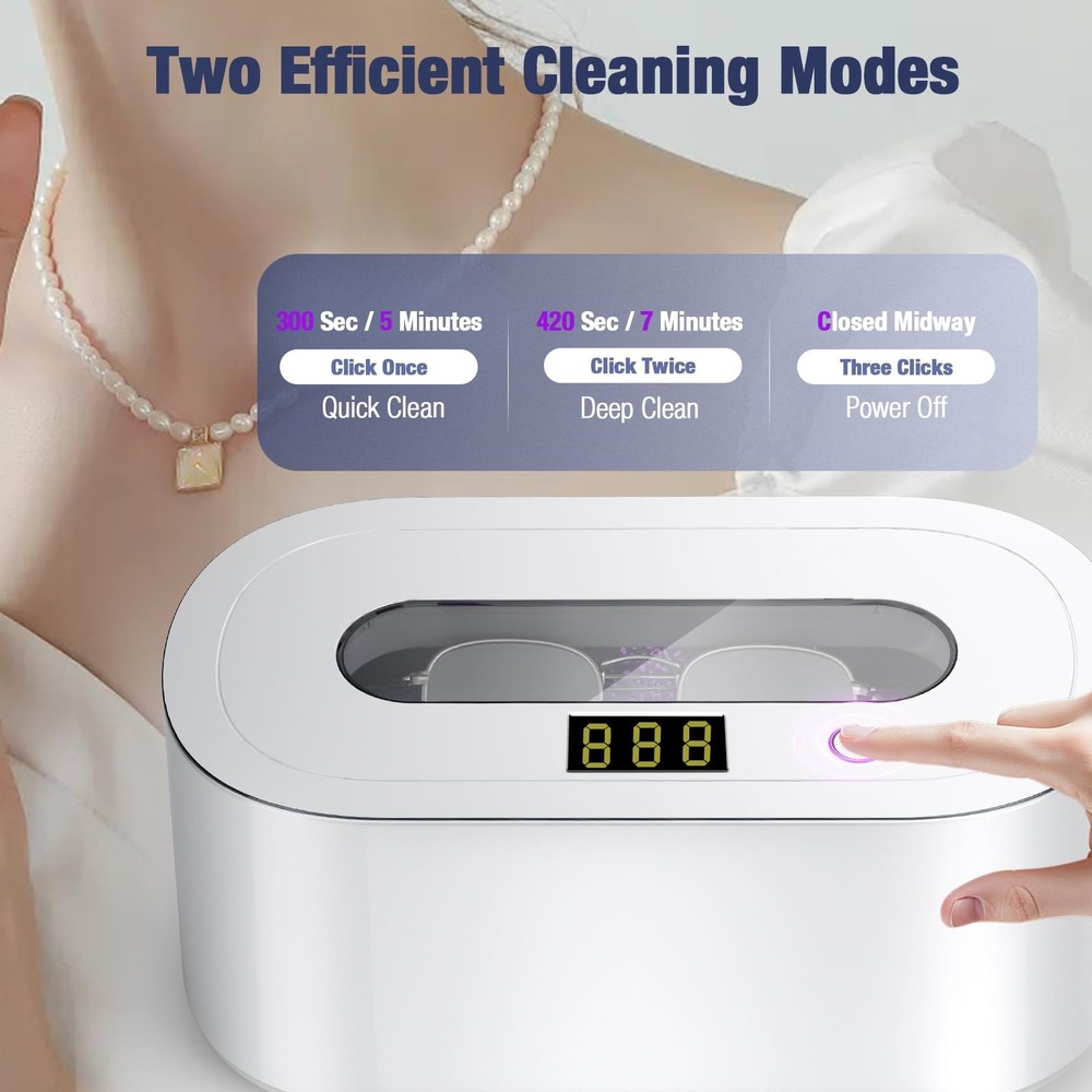 This ultra sonic cleaning machine uses advanced 48kHz high-frequency ultrasonic technology, coupled with 30W strong power to achieve 360° deep cleaning without dead ends, effectively removing stubborn stains and grease on jewelry, glasses, watches and other items, and quickly restoring their original luster. The sonic cleaner provides two modes: 5-minute quick wash and 7-minute fine wash. The LED light enhances the cleaning effect, and one-button operation automatically stops. The ultra sonic jewelry cleaner machine contains a 304 stainless steel liner, a noise reduction design with a working noise of less than 45 decibels, and a non-slip base to ensure stability. The large 350ml/12oz capacity can wash multiple items at the same time, and comes with a cleaning basket. The compact body of 7.67x4.05x3.42 inches weighs only 1.41 pounds, which is portable and practical, and is ideal for home and professional cleaning. Packing list: 1*ultrasonic jewelry cleaner, 1*cleaning basket, 1*power cord, 1*instruction manual, 1*warranty card Efficient Deep Cleaning: With 48kHz high-frequency ultrasonic technology and 30W powerful power, this sonic jewelry cleaner machine can perform 360-degree deep cleaning on jewelry, glasses, waterproof watches, retainers, dentures and other items in minutes. It can effectively remove tiny particles, surface grease and dirt in small grooves and crevices, making the items look brand new. Dual Cleaning Technology: The ultrasonic jewelry cleaner combines powerful ultrasonic and LED light technology to effectively restore the gloss of items and provide excellent cleaning performance. Two cleaning modes are available: 5 minutes (300 seconds) quick cleaning and 7 minutes (420 seconds) deep cleaning. Easy to operate, just add tap water and it will automatically stop working after the preset time. Smart Silent Design: Say goodbye to annoying buzzing sounds, the ring cleaner ultrasonic runs at a noise level of less than 45 decibels. Single click to start general cleaning, double click to start deep cleaning, to meet daily needs. For items with heavy stains, it is recommended to add alkaline cleaning solution for better results. Equipped with a digital countdown function, it clearly displays the remaining cleaning time. Compact & Portable Design: The jewelry cleaner measures only 7.67x4.05x3.42 inches, weighs 1.41 pounds, and has a capacity of 350ml/12oz. It is extremely convenient to carry and store when traveling, and takes up little space on the desktop. It uses a durable 304 stainless steel cleaning tank and is equipped with 4 non-slip rubber pads at the bottom to ensure the long-term stability of the machine. A cleaning basket accessory is included to make cleaning easier. Thoughtful Gifts & After-Sales: The jewelry cleaner has a novel and unique appearance, and the visual upper cover designed with high-end craftsmanship allows you to observe the internal cleaning process at any time. It is an ideal holiday gift for family, friends and lovers. We provide a 1-year warranty service and a 30-day no-reason return and exchange policy to ensure your worry-free shopping. If you encounter any problems, please feel free to contact us for help.