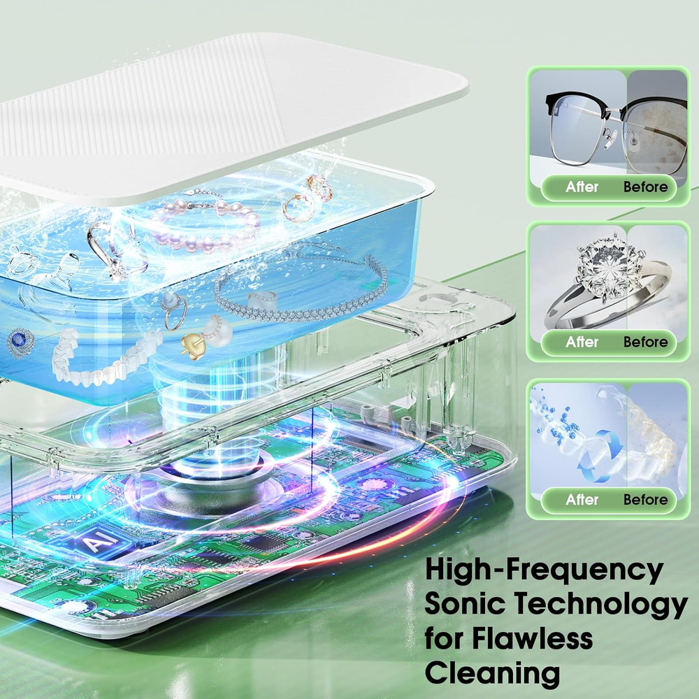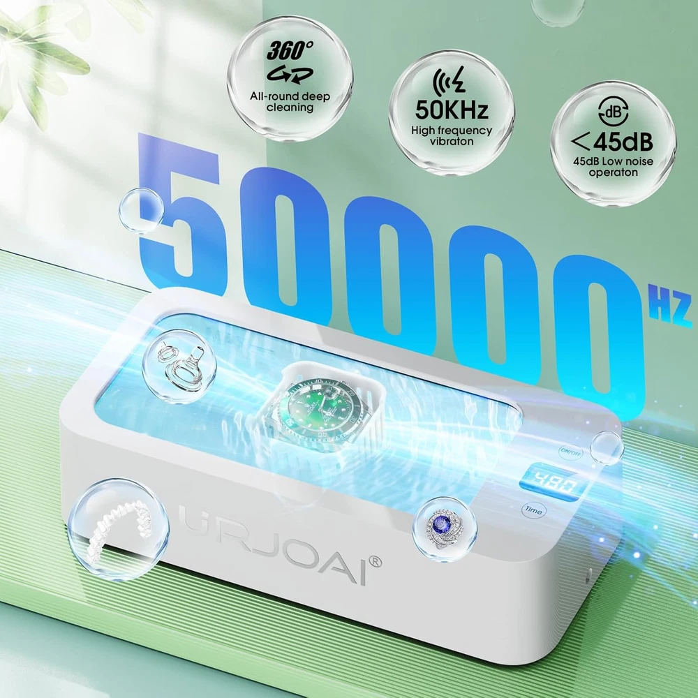 Ultrasonic Jewelry Cleaner 50Khz Jewelry Cleaner Ultrasonic Machine with 5 Timer 360° Deep Cleaning: Our ultrasonic jewelry cleaner utilizes 50kHz high-frequency sound wave technology, creating millions of cleaning bubbles that penetrate every surface to clean jewelry, glasses, dentures, and more. It delivers 360° thorough cleaning, effectively removing stubborn stains while protecting delicate items from damage, leaving them as good as new. 5 Timer Settings with Waterproof Design: This jewelry cleaner ultrasonic machine features a waterproof touch control design, ensuring ease of use in any environment. It offers five timer settings (90 seconds, 180 seconds, 280 seconds, 380 seconds, 480 seconds) to match the level of dirt on your items. Simply touch the button, and the device will start automatically and stop at the preset time to prevent over-cleaning. For enhanced results, use with ultrasonic cleaning solutions and warm water. Low Noise & Portable Design: With a noise level below 45 decibels during operation, this ultrasonic jewelry cleaner machine ensures a quiet and comfortable user experience. Its compact and lightweight design makes it perfect for home use or travel, allowing you to efficiently clean your jewelry, glasses, and other accessories wherever you are. Large Capacity: The 500ml stainless steel tank, made from premium 304 stainless steel, offers ample space to clean multiple items simultaneously, including rings, necklaces, watches, dentures, makeup brushes, and more. The spacious design ensures that every item gets a comprehensive and thorough cleaning, adding convenience to your daily routine. After-Sales : Crafted with high-quality 304 stainless steel, this ultrasonic cleaner is durable and safe to use. We provide a 1-year and have a dedicated customer service team ready to assist with any questions, ensuring a worry-free cleaning experience. Product Description Country of Origin China Package Dimensions 9.92 x 5.43 x 3.5 inches; 1.57 Pounds Complimentary Shipping and Easy Returns Need to return something? Enjoy our 30-day hassle-free return policy! Take advantage of free shipping across all 48 contiguous states! Your order will be dispatched within 1-2 business days once payment is confirmed. Your Opinion Matters! Your happiness is our main goal! We welcome your feedback! If you encounter any problems, reach out to us right away, and we’ll be here to help. Explore the Extraordinary! Our collection showcases fascinating products that are sure to capture your attention. What surprises await you? Delve in and discover unique items that enrich your daily life. Don't miss the amazing things we have in store for you!