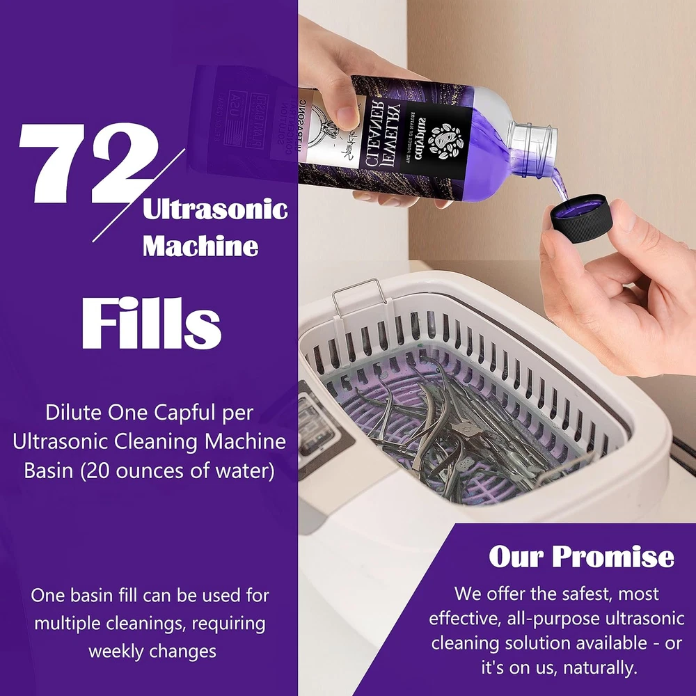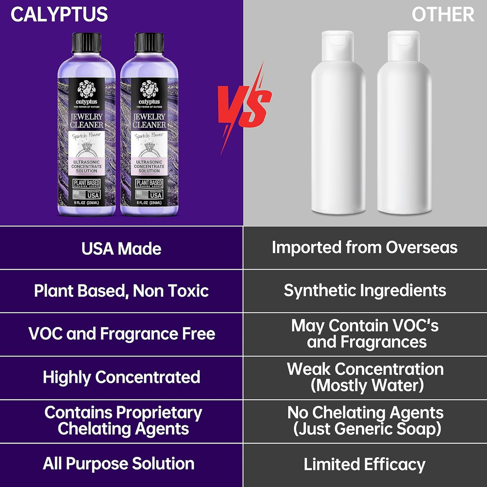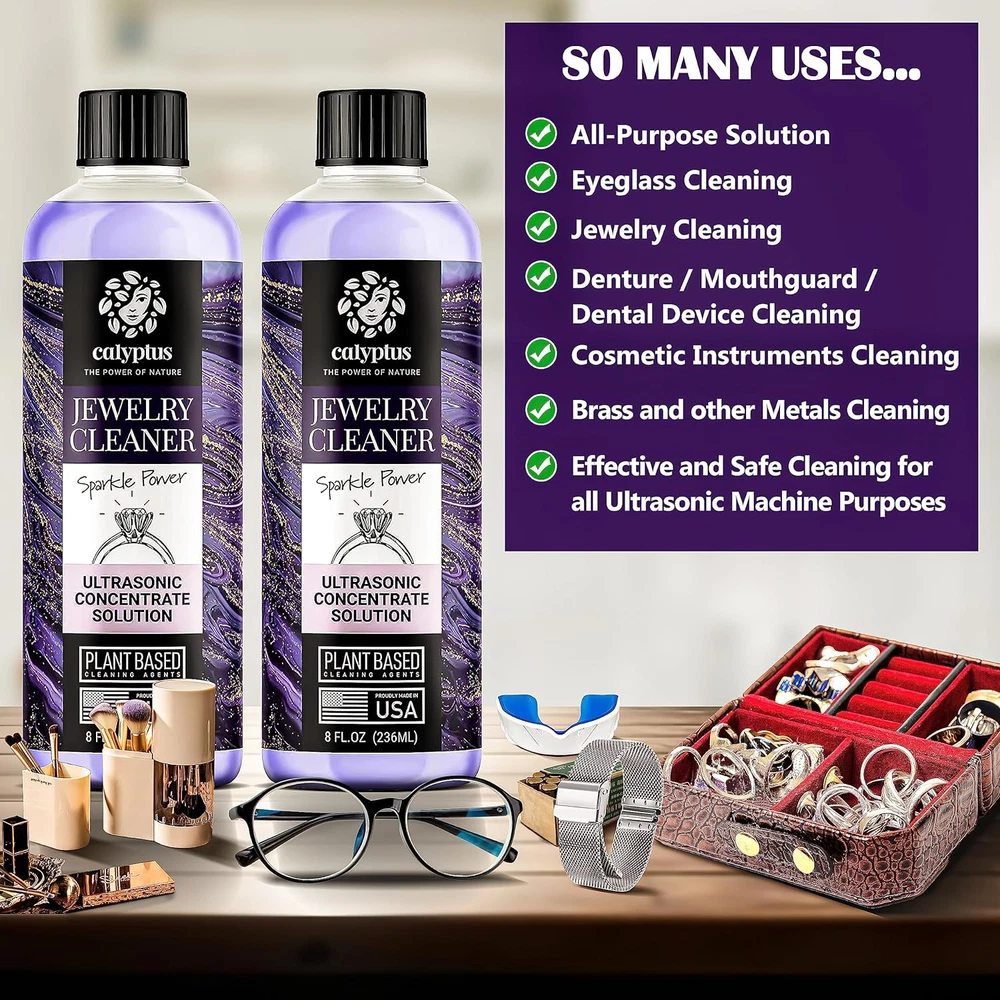 UNLEASH THE POWER OF CONCENTRATION: Our ultrasonic solution features highly concentrated plant-based surfactants, ensuring maximum cleaning power for a wide range of solutions. With proprietary ingredients and a concentration that is up to 10 times higher than others, our ultrasonic cleaning solution is your ultrasonic cleaner machine's best friend. BREAK FREE FROM GRIME: Our non-toxic jewelry, and eyeglass cleaner formula features a proprietary chelating agent that binds tightly to metal ions, effortlessly dislodging grime from the surface of your precious items. THE ULTIMATE ALL-PURPOSE SOLUTION: From jewelry and eyeglasses to mouthguards, brass, and more, our ultrasonic cleaner solution handles all your cleaning needs with ease. Say goodbye to multiple specialized cleaners and embrace the convenience of one solution for everything. UNPARALLELED DILUTION EFFICIENCY: Crafted exclusively in the USA, our concentrated ultrasonic cleaning solution offers impressive dilution ratios of 1:140 with water or one capful per 20 ounces of water to fill your ultrasonic jewelry cleaner machine basin. With two bottles, enjoy 72 basin fills, providing multiple uses and long-lasting cleaning power. THE CALYPTUS PROMISE: We deliver safe, natural, and effective ultrasonic solutions that you'll love. If for any reason you're not satisfied with your purchase, let us know, and we'll gladly make it right – naturally. Product Description