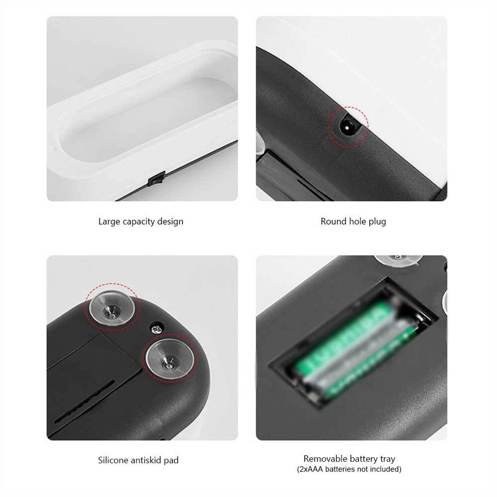 Features 1. Multifunctional jewellery cleaner: can be used to clean jewellery, rings, glasses, dentures, watches coins, etc. 2. Ultrasonic cleaning: "cavitation effect", fast cleaning of stains. 3. One key start: 360° purification, deep cleaning of crevice dirt 4. How to use: Add the right amount of water, one key to start cleaning, efficient cleaning, easy to remove stains 5. Advanced cleaning method: Stop using traditional liquid cleaners and brushes, which can damage your valuables and hands. Ultrasonic cleaners are the perfect alternative to traditional liquid cleaners. Making cleaning dirt easier and safer, you can clean your items anywhere, anytime, without the ultrasonic waves scratching or damaging your valuables. Description. Material: ABS Size: As shown in the picture Two power supply options: Battery model: 2 x AAA batteries (not included) / USB cable power Product list. USB Powered. 1x Ultrasonic Make-up Tool Jewellery Contact Lens Braces Watch Cleaner 1xUSB cable Battery Powered. 1xUltrasonic make-up tool jewellery contact lens braces watch cleaner (battery not included)