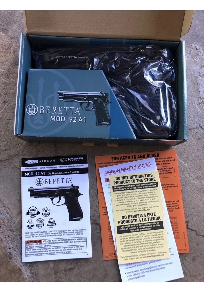 Experience the realistic feel of the Umarex Beretta M92 A1, a top-tier .177 caliber air pistol designed for both hobbyists and serious shooters. This model boasts a 310 fps velocity, ensuring a potent blend of power and accuracy, whether you're target practicing or engaging in outdoor shooting sports. The pistol features a user-friendly semi-auto and full-auto action that offers an authentic shooting experience. Crafted with precision by Umarex, the M92 A1 model uses BB ammunition and comes with the reputable brand's quality assurance, ensuring reliability and consistent performance. This listing complies with eBay's air gun policy and I will only ship air guns to buyers in jurisdictions where permitted to by applicable laws https://www.ebay.com/help/policies/prohibited-restricted-items/airsoft-air-rifle-bb-guns-policy?id=5045 This listing complies with eBay’s air gun guidelines found here and I will only sell and ship air guns to buyers in jurisdictions where permitted by applicable laws, http://pages.ebay.com/help/policies/firearms-weapons-knives.html Shop is not responsible for knowing specific state, county and city laws regarding air guns. It is your responsibility to determine whether it is legal for you to purchase and possess our merchandise in your area. Please research your own local laws and fully comply with them when placing an order on our site. By ordering you represent and warrant that you are 18 years of age or older, you know and are in compliance with all laws in your state, county and city and fully comply with them, and that all other information you provide to us is accurate and complete. Below are EXAMPLES of some state and local Airgun shipping restrictions CA (San Fransico, Zip Codes 941**) IL (Chicago, Zip Codes 606**, 60701, 60706, 60707, 60712, 60803, 60805, 60827) NY (NYC and Burrows, Buffalo, Rochester, Yonkers, Zip Codes 100**-104**, 11004, 11005, 111**-114**, 116**) PA (Philadelphia, Zip Codes 19019, 19059, 19093, 19099, 191**, 19244, 19255) TN (Johnson City, Zip Codes 37601, 37602, 37604, 37605, 37614, 37615) Washington, D.C. (Zip Codes 20001–20098, 202**-205**) CT (Bridgeport, Stratford, and Wethersfield) FL (Miami and Key West) RI (Entire State) We do not ship to Alaska and Hawaii. MUST BE 18+ to Purchase