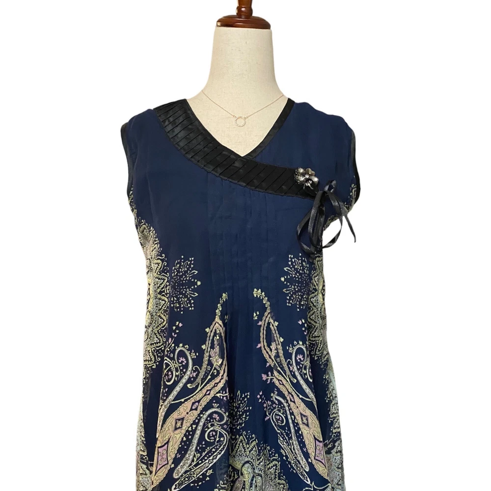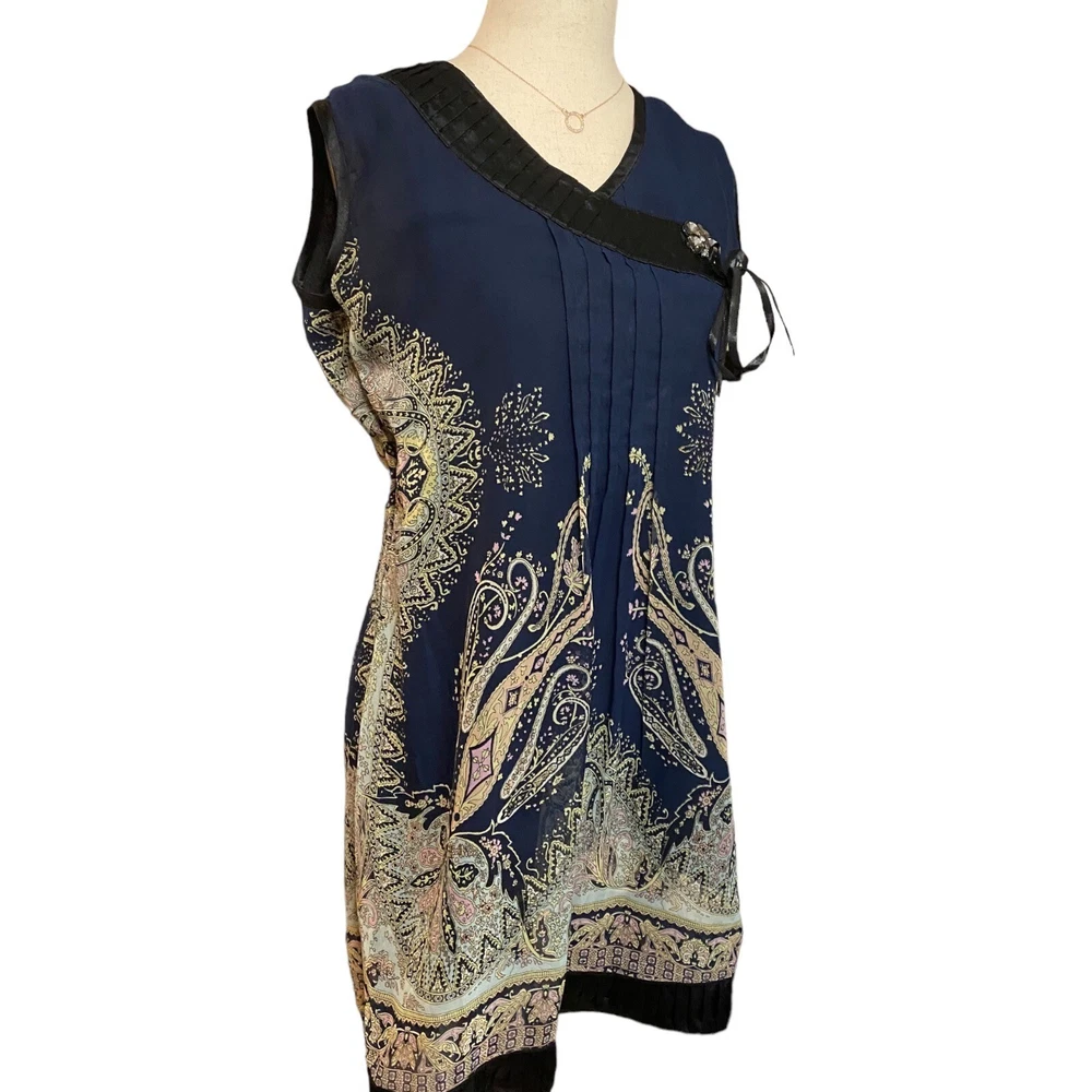 Unbranded Shift Dress Women Size XXL Blue Black Paisley Ribbon Accents Bow Good pre-owned condition, no tag except size tag. ***Minimal wear, is missing one of the four crystals in the broach accent (see all photos - should be easy to find a similar crystal replacement at JoAnn or Michaels to hot glue). Features: - perfect dress for casual summer gatherings, church or family dinners - vibrant shades of blue and black; colorful paisley patterned dress - crystal & bow accents; short sleeves - ribbon detailing at bust and hemline; pleating at mid-section - fully lined; 100% polyester shell and lining - made in China Size: XXL Measurements laying flat: pit-to-pit: 19.5" length: 32.5 waist: 18" Ships FAST & AFFORDABLE next business day. Offers welcome.