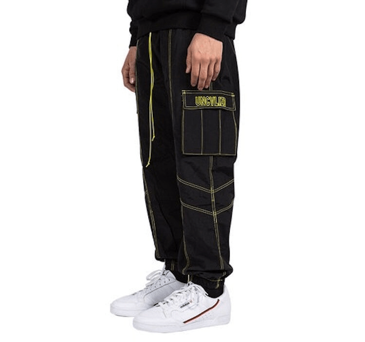Uncvlizd Men’s Cargo Pants Size X-Large New in plastic Color Black with lime green stitching Embroidery logo on pockets Side seam pockets, welt pockets, and cargo pockets