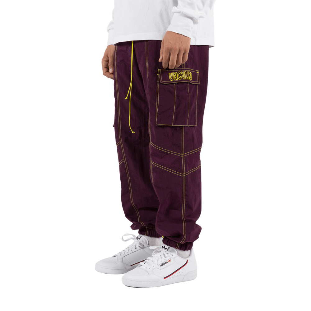 Uncvlizd Cargo Pants- Plum size X-Large Premium Nylon Side pockets Single back pocket Cargo pockets Contrast stitched seams Elastic waistband and cuffs Contrast shock cord drawstrings at waist and cuffs w/ adjustable clasp Embroidered branding on cargo pocket