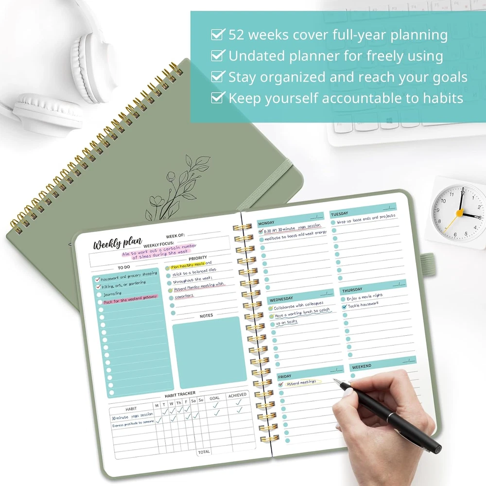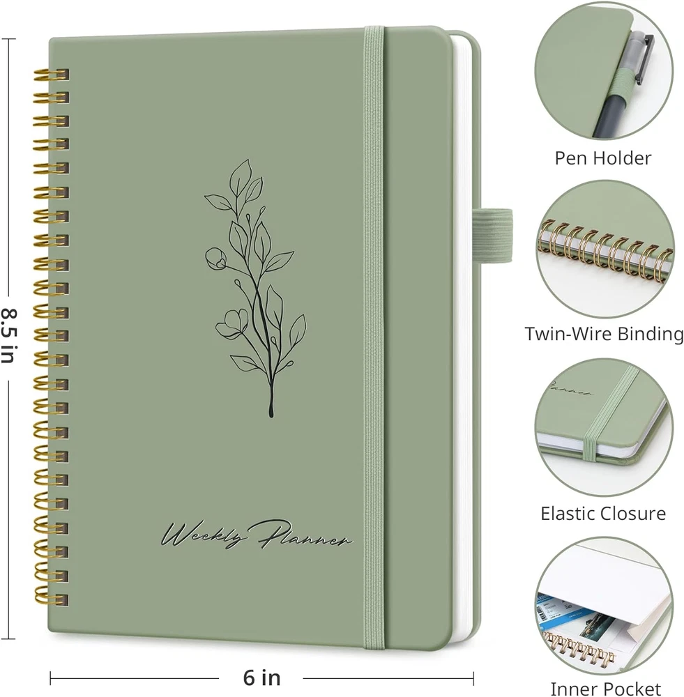 Menu Other Items Feedbacks About Us Contact Us Add To Favorites Undated Weekly Planner, Weekly to Do List Notebook with Goal & Habit Tracker Organizer, A5 Weekly Planner Notebook with Spiral Binding, 6.1" X 8.2" - Green Efficient Weekly Planning - Utilize the 52 Weeks Undated Planner to articulate and prioritize weekly goals and to-do lists during 2024. Assign specific tasks to each week for optimal efficiency while allowing flexibility without guilt if a week is missed. Elegant and Compact Design - Enjoy a thick cover with gold coil, offering a romantic and gentle aesthetic. The weekly planner notebook's perfect size at 6.1'' x 8.2'' ensures easy portability, making it convenient for daily use. Cultivate Healthy Life Habits - Undated weekly planners, weekly goals, To Do list, and habit tracker together for daily affairs. Track healthy habits for each week and use the checkbox as a visual reminder. Premium Paper Quality - Experience a smooth writing surface on thick, 100gsm paper that prevents bleed-through. The planner ensures a high-quality feel and enhances the overall writing experience. Versatile Usage - Ideal for managing daily affairs, cultivating healthy life habits, and maintaining overall progress. A quick glance provides a comprehensive overview of chores, making it the perfect companion for effective time planning. Open your fabulous 2024 with the planner. Product Description Taja's Planner, Journal & Calendar Add to Cart Add to Cart Add to Cart Add to Cart Add to Cart Add to Cart Add to Cart Customer Reviews 4.6 out of 5 stars 35 4.9 out of 5 stars 27 4.6 out of 5 stars 86 4.5 out of 5 stars 108 4.6 out of 5 stars 157 4.6 out of 5 stars 9 4.8 out of 5 stars 87 Price $5.99 $ 5 . 99 $7.99 $ 7 . 99 $5.99 $ 5 . 99 $5.99 $ 5 . 99 $5.99 $ 5 . 99 $6.99 $ 6 . 99 $9.99 $ 9 . 99 Size 5.7" x 8.6" A5 or B5 7" x 10" 6.5" x 3.5" 8.3" x11.7" 14.7" x 11.5" 5.3" x 8.2" Feature Hardcover Hard Cover Spiral Binding Staple Bound Spiral Binding Spiral Bound Hardcover Color Multicolor Multicolor Multicolor Forest/Purple/Navy Abstract Floral Festive Pattern Multicolor Quantity 160 Pages / 80 Sheets 240 Pages / 120 Sheets 74 Pages / 37 Sheets 64 Pages / 32 Sheets 18 Months 18 Months 182 Pages / 91 Sheets Usage Scenario Office School & Home Supplies Office & Home & School Office School & Home Supplies Office School & Home Supplies Home & Office Supplies Home & Office Supplies Office School & Home Supplies Item Specification Sheet Size A5 Calendar Type Non Dated Format Notebook, Organizer Paper Size A5 Color a. Green Binding Unknown Binding Cover Material Paper Material Paper Material Type Paper Additional Features Gold Coil Binding Item Weight 0.5 Pounds Target Audience Adult Year 2021 Ruling Type Ruled Recommended Uses For Product weekly planning, goal setting, to-do list management, habit tracking, daily affairs management Model Year 2021 Item Dimensions L x W 8.5"L x 6"W Dimensions Shipping Returns Additional Info Product Dimensions: 6.1 inches x 8.2 inches x 0.6 inches. Weight: 0.5 lb Fast shipping is very important for us. Our standard shipping service is FREE. Your order will be shipped within 1-3 business days upon full payment received. Most items are delivered within 3-5 business days, however, please allow 3-10 business days. We are shipping only to USA. We only ship to the confirmed Paypal address. We reserve the right to cancel any order for any reason at any time. We are not responsible for undeliverable addresses. We offer a 30 day return policy from checkout winning date. Your satisfaction is guaranteed! If for any reason you are unhappy with your item, just return it within 30 days for a full refund, minus shipping cost. Please contact us prior to initiating a return so that we can issue you a refund authorization. Items defective upon receipt must be packaged in their retail packaging as if new and returned with a detailed description of the problem. Return shipping fees are not refundable. We reserve the right to decline any returns if the above guidelines are not followed. All of our items, unless otherwise stated, will only run on 120 volts. Please check to make sure your country complies with these specifications. If you have a problem or question regarding your transaction please contact us before leaving any type of feedback. We will work with you to resolve any problem you may have.