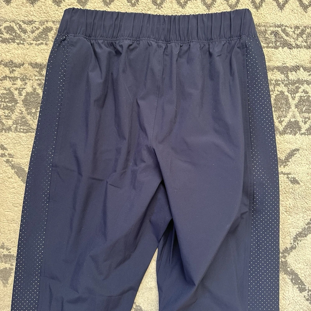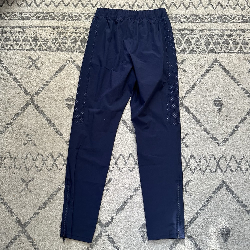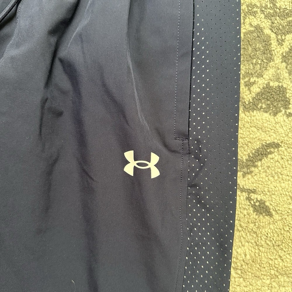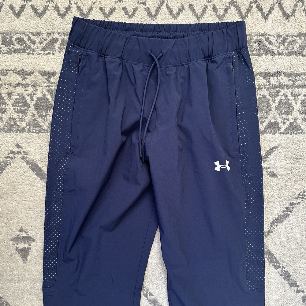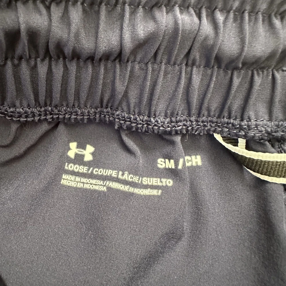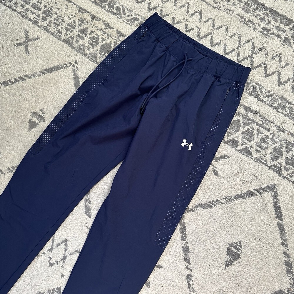 Under Armour Active Warm Up Pant Navy Blue Mens Size Small Loose Fit. In good used condition with no holes or stains! The Under Armour Active Warm Up Pant is designed for men in a size small with a loose fit. Made of polyester blended fabric, these navy blue track pants feature a drawstring closure and an elastic waist for comfort. With a focus on activewear, they are suitable for various activities like gym training, cross-training, basketball, and running. The pants also include pockets for added convenience, making them a practical choice for those seeking athleisure apparel with a sporty style.