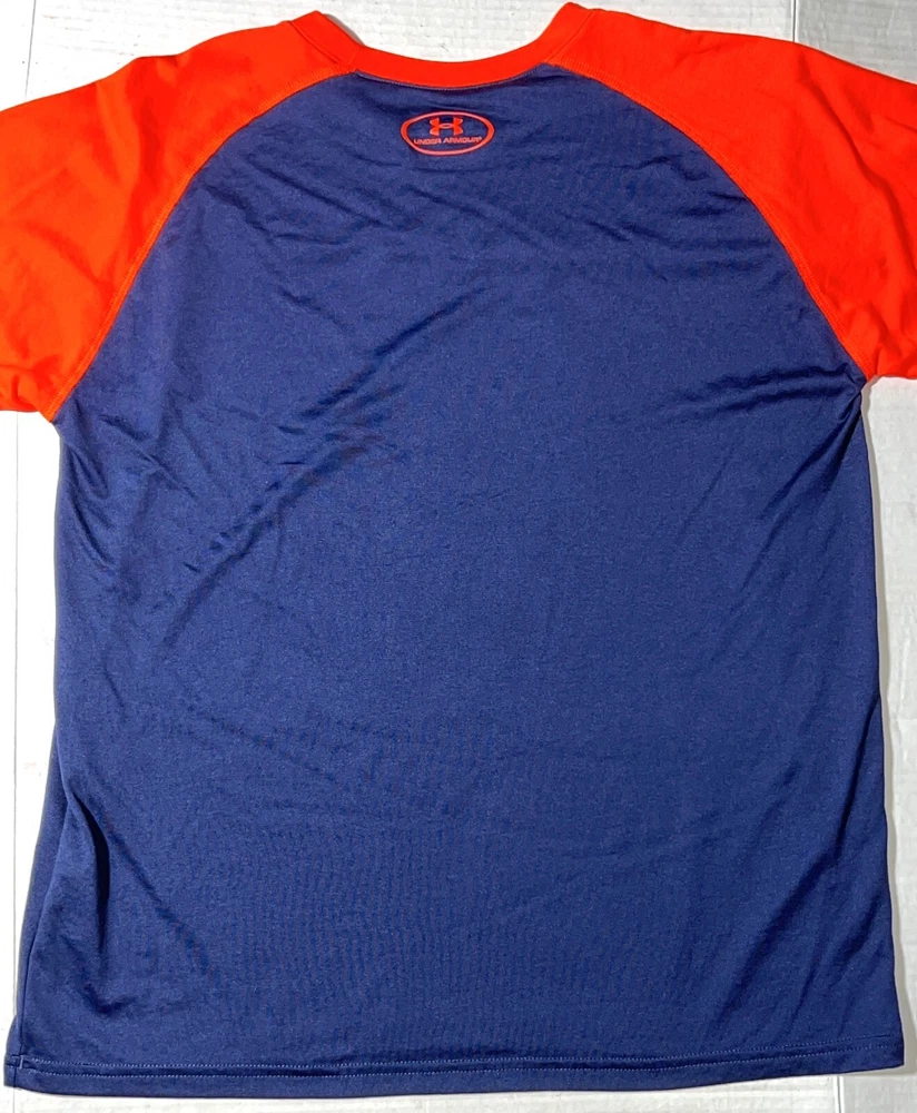 Under Armour Blue Orange Long Sleeve Heat Gear Loose Fit Athletic Shirt Top ~ Youth Boy's Size YXL = Youth XL. Measures: 20" flat across the front from underarm to underarm unstretched and 25.5" from shoulder to bottom hem.