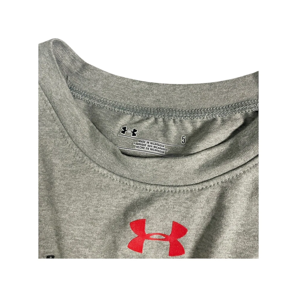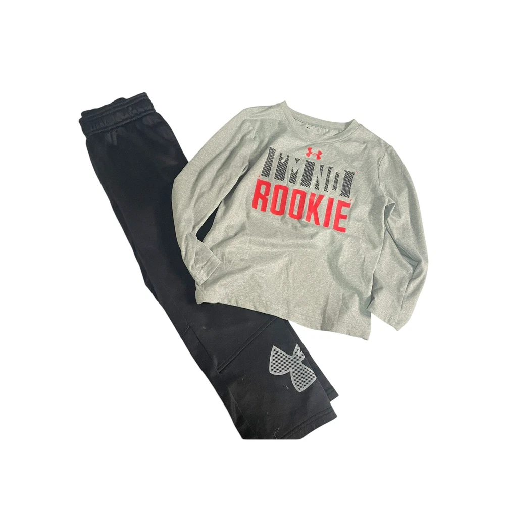 This Under Armour boys' 2-piece set includes black athletic pants and a gray top, both in size 5. The set is designed for active wear and casual occasions, featuring long sleeves and a pull-on closure. Made of 100% polyester, the outfit is suitable for various seasons and has an athletic fit. The style is sporty with a colorful theme, ideal for young boys who enjoy outdoor activities. in very good condition All Measurements Are Approximate Please email us with any questions! ** LIKE THE ITEM BUT NOT THE PRICE, REASONABLE OFFERS ACCEPTED