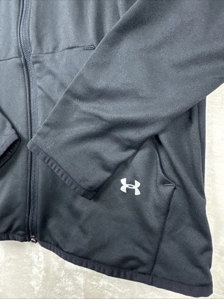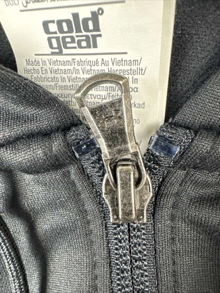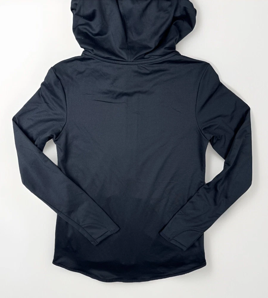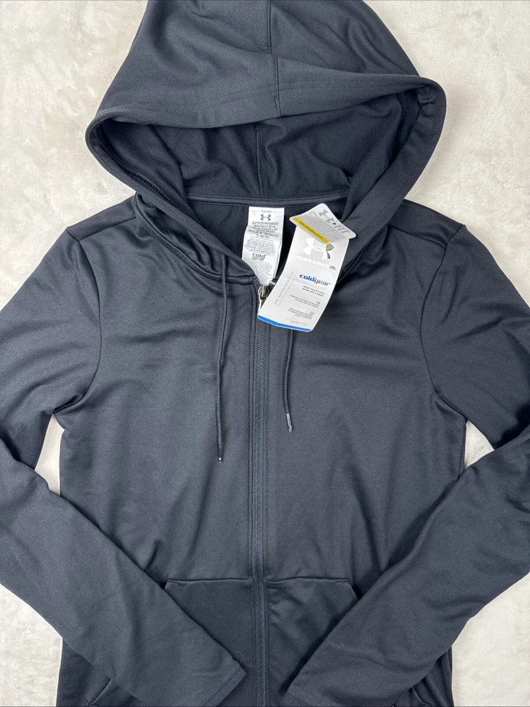 This is an Under Armour Cold Gear full zip hoodie for women in size XS. It is designed for activewear and features a softshell fabric with a hood, thumb holes, and pockets. The hoodie is black with the Under Armour logo accents, suitable for all seasons, and has a classic long sleeve style. Perfect for running, jogging, cycling, golf, soccer, and other athletic activities.
