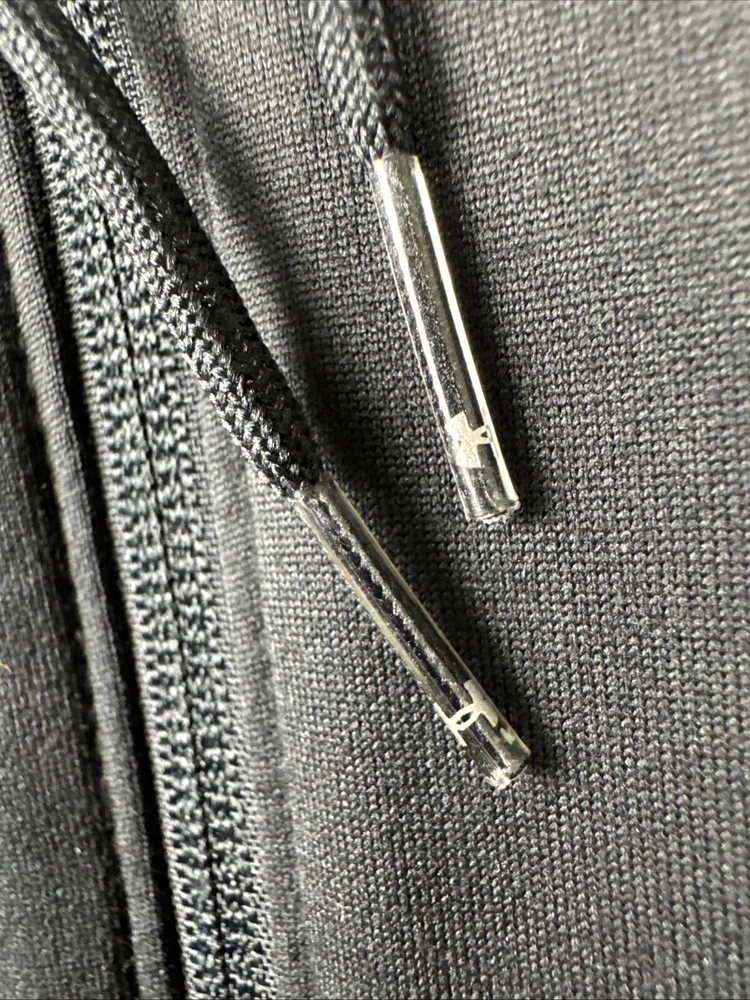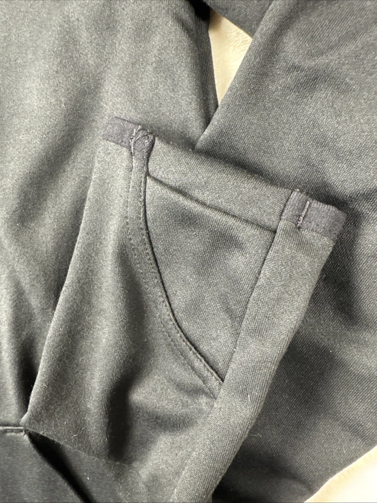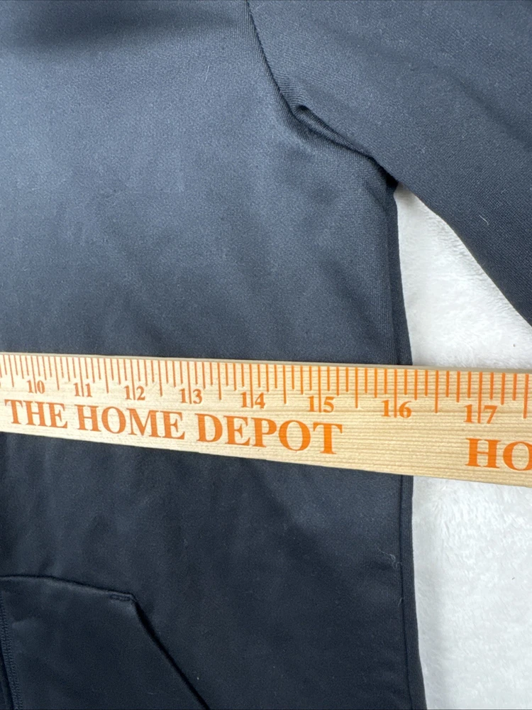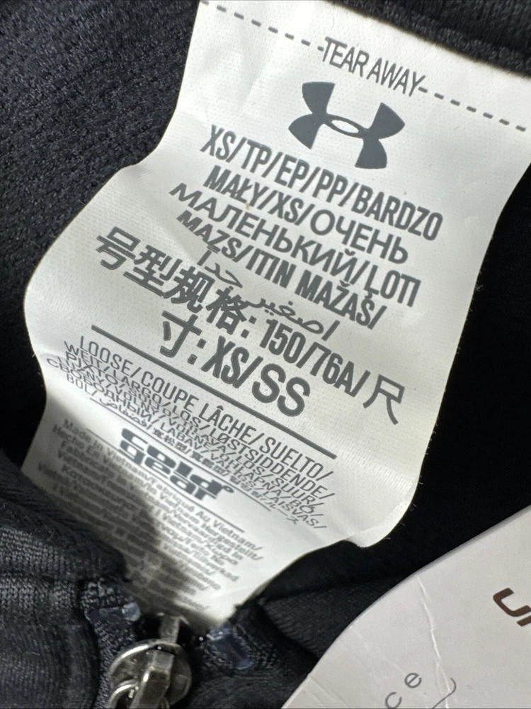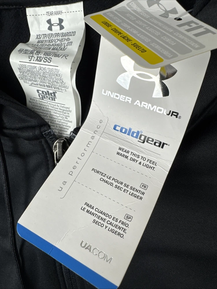 This is an Under Armour Cold Gear full zip hoodie for women in size XS. It is designed for activewear and features a softshell fabric with a hood, thumb holes, and pockets. The hoodie is black with the Under Armour logo accents, suitable for all seasons, and has a classic long sleeve style. Perfect for running, jogging, cycling, golf, soccer, and other athletic activities.