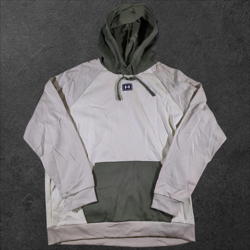 Elevate your workout wardrobe with this Under Armour Rival Fleece Hoodie in a solid green colorway. This hoodie features a drawstring closure and a crew neck design, with long sleeves and a relaxed fit for ultimate comfort. The hood is perfect for keeping you warm on chilly gym days or for outdoor activities like hiking or running. Crafted from durable polyester material, this hoodie is machine washable and easy to care for. The logo accents add a touch of style, while the Under Armour theme speaks for itself. This hoodie is ideal for gym and training, track and field, walking, CrossFit, skateboarding, and running and jogging. Available in size 2XL, this hoodie is a must-have for any athletic man's wardrobe.