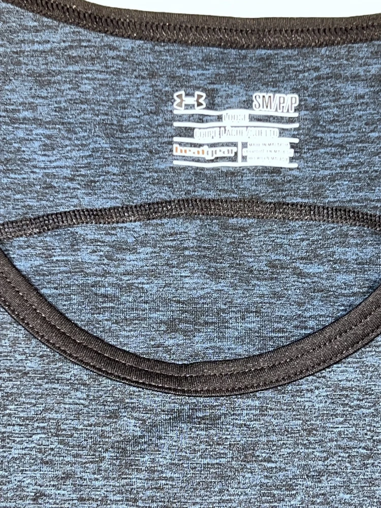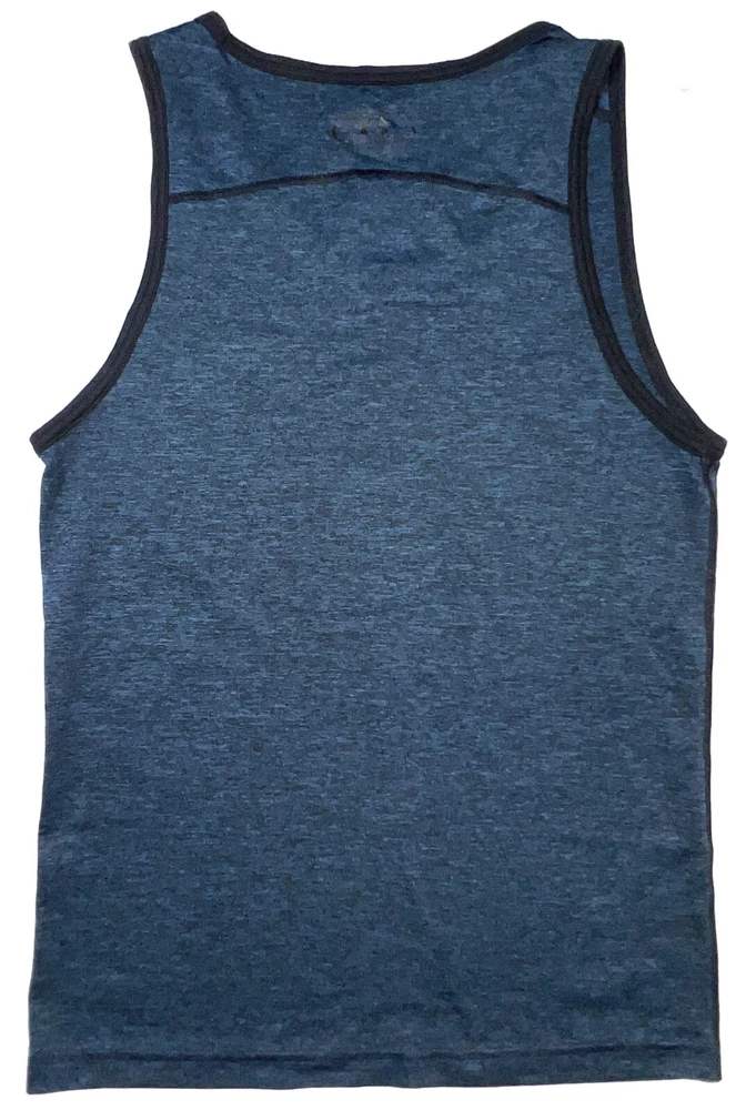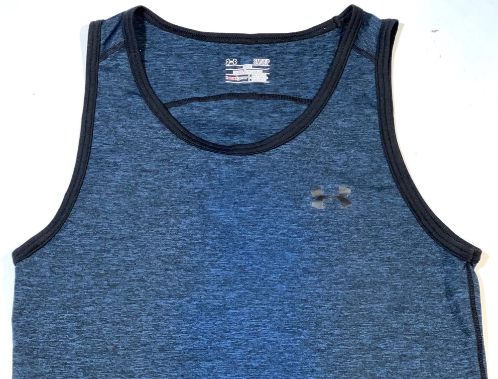 Under Armour Heat Gear Blue Black Marbled Sleeveless Loose Fit Tank Top Shirt ~ Men's Size S - SM Small. Measures: 18" flat across the front from underarm to underarm unstretched and 28" from shoulder to bottom hem.
