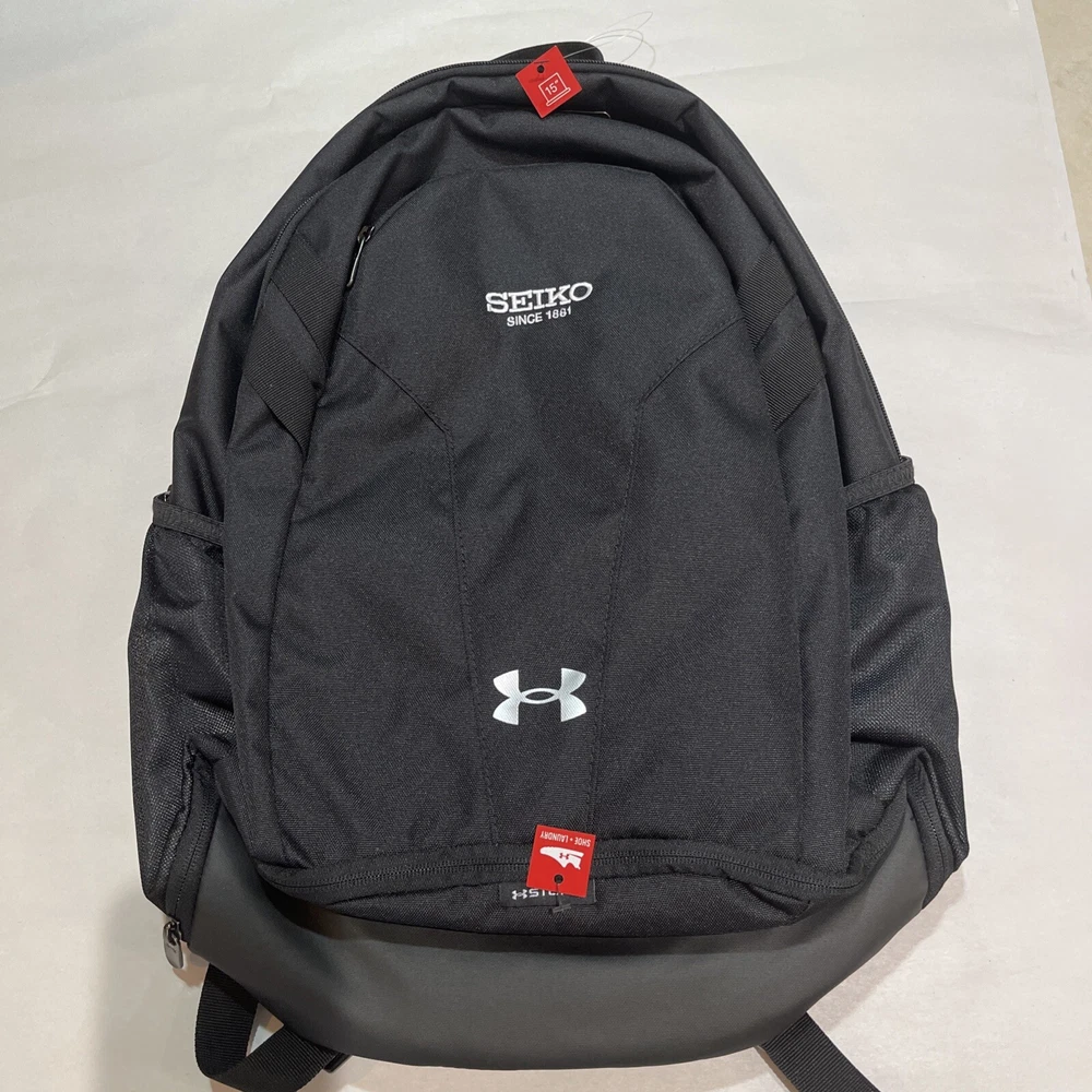 Under Armour Hustle 5.0 Backpack w/Promo SEIKO Black See Pics showing Details UA Storm technology delivers an element-battling, highly water-resistant finish Breathable air-mesh padded back panel & adjustable, HeatGear shoulder straps for total comfort Soft-lined laptop sleeve—holds up to 15" MacBook Pro or similarly sized laptop Water-repellent front valuables pocket to keep your stuff safe Large, gusseted front laundry/shoe pocket placed at bottom of bag Brand New