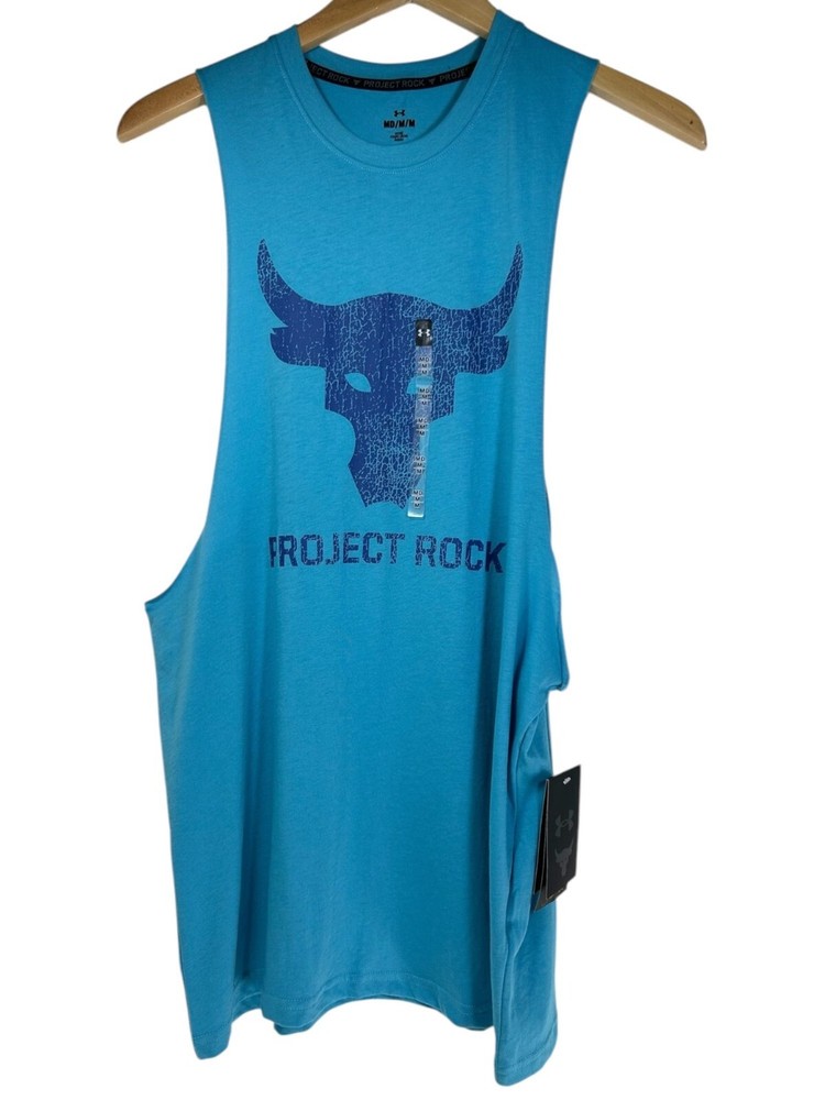 New with tags; hard to find tank! Under armor project rock Brahma bull tank top in two tone blue Mens Large Bull logo on front with 'Project Rock' underneath Round crew neckline Sleeveless Moisture wicking and lightweight Great for the gym or any athletic/casual occasion Relaxed fit Made with polyester/Cotton Made in Cambodia #underarmour #underarmourprojectrock #tanktop #underarmourtanktop #projectrock #underarmourmens #underarmourshirt #underarmourtank #underarmourprojectrocktanktop