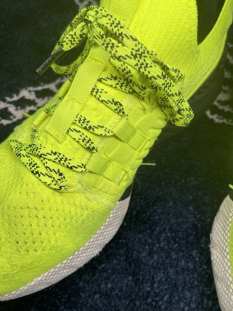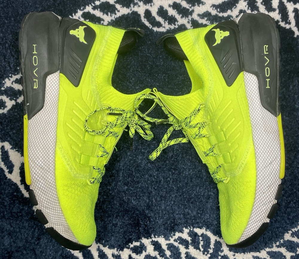 This is a pre-owned pair of Under Armour Project Rock 3 sneakers in size 9.5 for men. The color is High-Vis Yellow/Black/High-Vis Yellow, featuring a mesh upper material and a vibrant design. The style code is 3023004-306, released in 2021 with a release date of 20210205. Made in Vietnam, these athletic shoes are part of the Under Armour Project Rock product line.