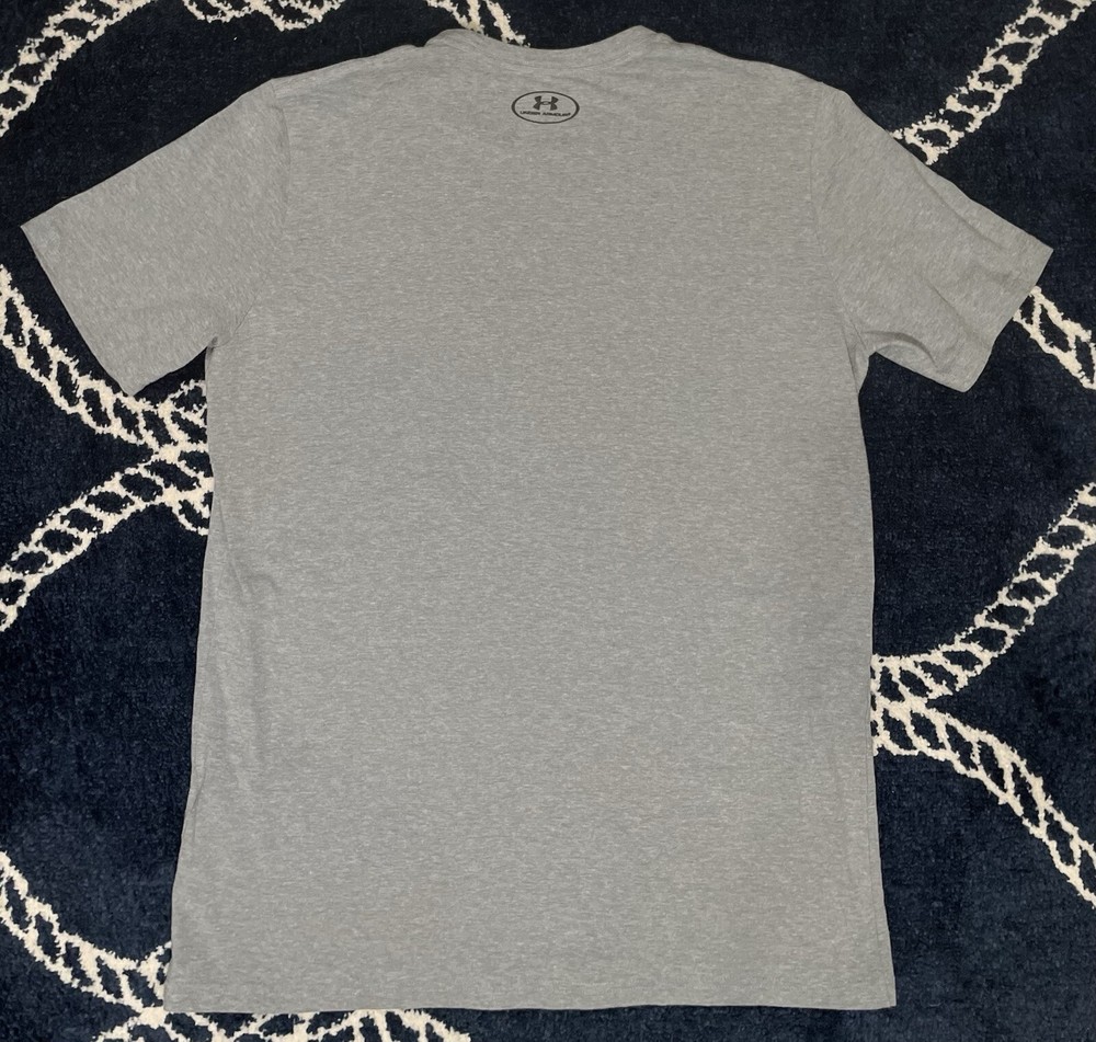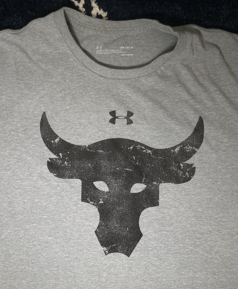 This is a gray Under Armour Project Rock T-Shirt in size Medium with a loose fit. It features a crew neck, short sleeves, and a solid pattern with a graphic print of a Brahma Bull logo. Made of a polyester blend jersey fabric, it is easy to care for and suitable for activewear and casual occasions. The T-shirt is part of the Project Rock product line and is designed for various physical activities like weightlifting, running, and basketball.