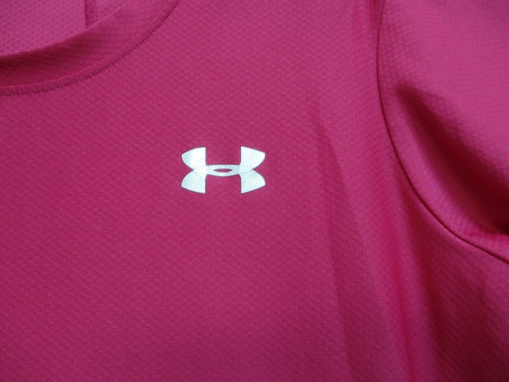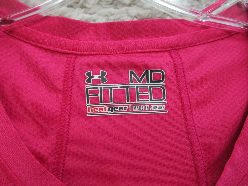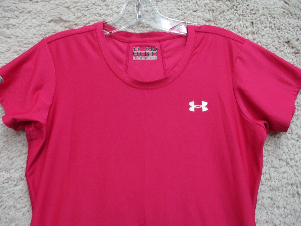 Theme: Logo Style: Pullover Features: All Seasons, Easy Care, Lightweight, Stretch Size Type: Regular Size: M Performance/Activity: Cross Training, Gym & Training, Running & Jogging Department: Women Closure: Pullover Type: T-Shirt Brand: Under armour Occasion: Activewear Neckline: Crew Neck Fabric Type: Blended Fabric Product Line: Under Armour HeatGear Color: Pink Pattern: Solid Sleeve Length: Short Sleeve Fit: Athletic