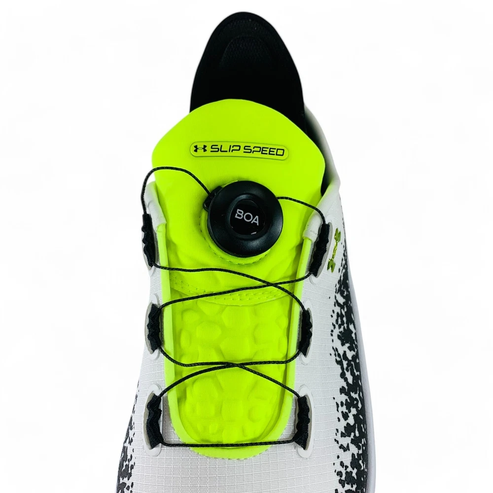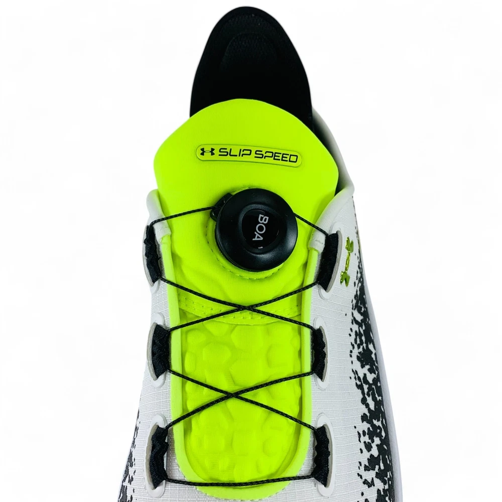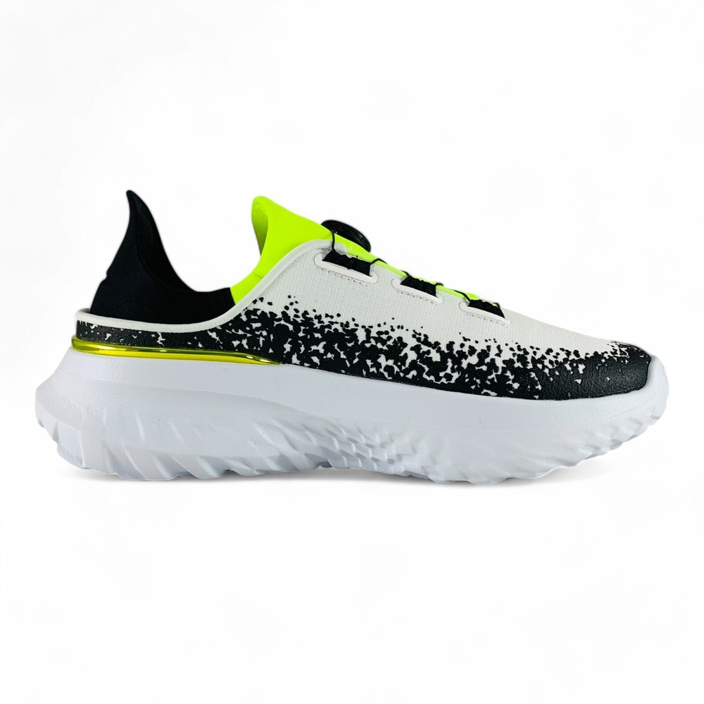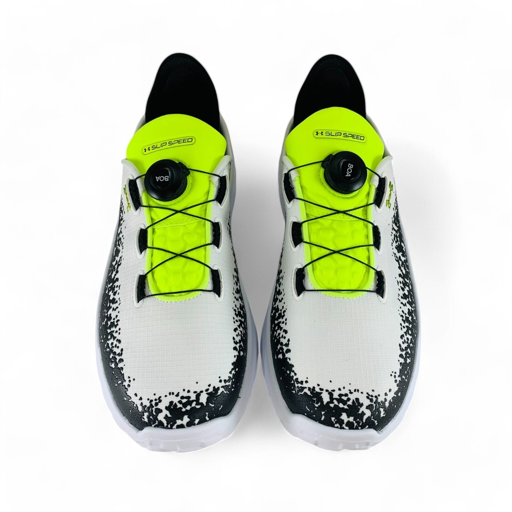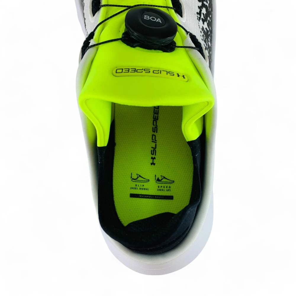 Under Armour SlipSpeed Mega White Black Men's Running Shoes Sneakers 3028539-107 Featuring a supersized midsole for mega energy, these Under Armour SlipSpeed Mega men's shoes are arguably the most versatile sneakers every made by Under Armour. They feel great, cushion better, fit perfectly, handle your toughest runs, and have a heel that converts easily from slip mode to speed mode. Their BOA Fit System enables you to fit the shoes exactly to your personal needs, one click at a time with a 12-point lockdown system. The breathable upper material along with the interior foam padding keep your feet cool throughout the day. Don't wait, purchase your very own pair of these comfortable athletic sneakers before they're all gone. Product Condition These shoes are brand new and include their original shoe box, unless otherwise noted. The shoe box may have minor damage. This is a 100% authentic product, guaranteed or your money back. Sizing All size options provided in this listing are U.S. men's shoe sizes. Please reference the chart appearing in our product images to find your approximate size conversion (e.g. UK sizes, EU sizes, etc.). More Details Suggested Retail Price: $140 Brand: Under Armour Model: SlipSpeed Mega White Black Neon Yellow Style Code: 3028539-107 Gender (for sizing): Men Age: Adult Main Color: White Customized: No Closure: BOA Fit Technology Shoe Shaft Style: Low-top Great For: Running, Jogging, Walking, Running Errands, Going Out, Daily Activities, Casual Wear, Going to Work