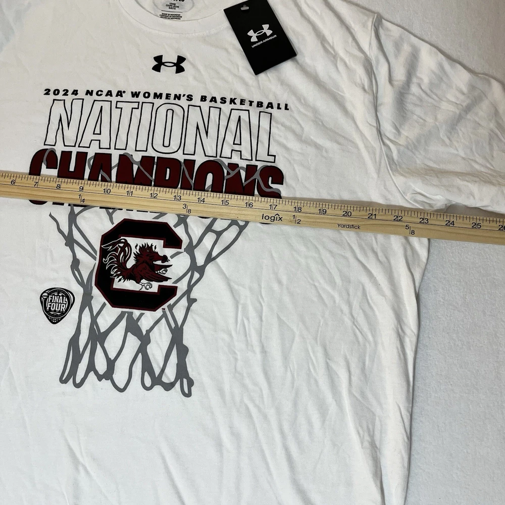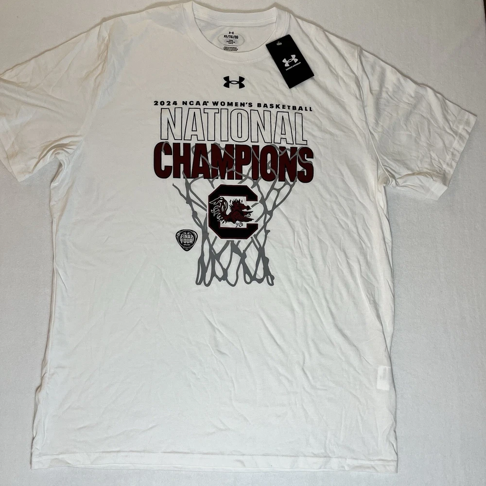 General Notes Color(s) may slightly differ due to monitor settings and lighting. Please check out our other listings as you may be surprised at what you find. Please read the item description and view all the photos. The photos will provide a good representation of the item (see the first note above about colors). Any flaw(s) will have a dedicated photos to show the flaw(s) You may want to compare the measurements of this item to something you already have that fits. If you experience a problem with your item, please contact us so that we can attempt to fix the issue promptly. UA South Carolian Gamecocks Women's National Champs T-Shirt Men’s XL Company: Under armour Condition: New With Tags Color: White Style: Regular Fit Sleeves: Short Sleeve Collar: Crew Neck Material: Cotton Size: XL (Extra Large) Sleeve Length: Short Sleeve Shirt Length: 30.5” (from base of collar to bottom of shirt) Shirt Width: 23” (from pit to pit) Wash Instructions: Machine Wash 2024 NCAA Women's Basketball NATIONAL CHAMPIONS and Team Logo graphics on front in Maroon and Black See photos for measurements and shirt details and appearance Measurements are approximate (see photos) Item Description from the Seller Add a commemorative tee to your South Carolina gear with this 2024 Women's Basketball National Championship piece and show your pride in style. This clean white tee with maroon and black printed graphics make for a nice look. This Men's Size XL is New With Tags. Not many of these left, so Buy t Now, here. Inv. #0414