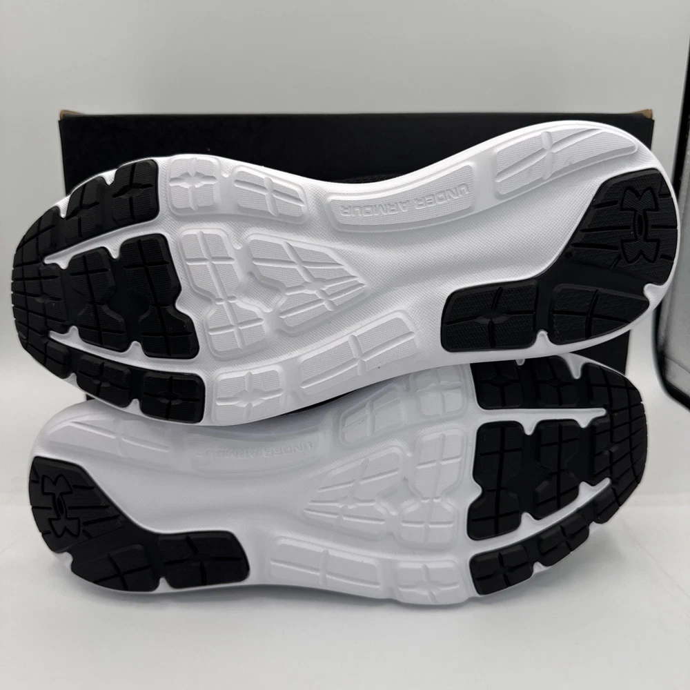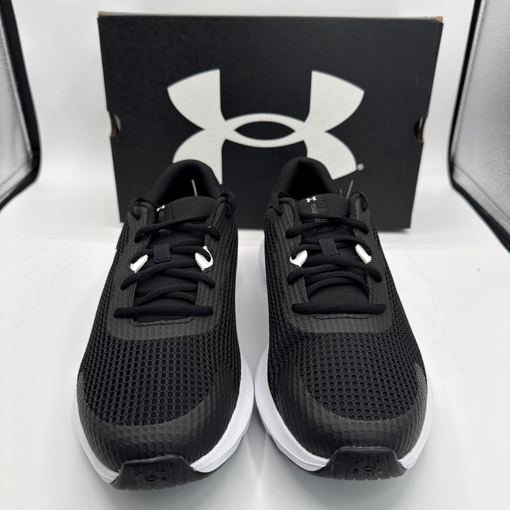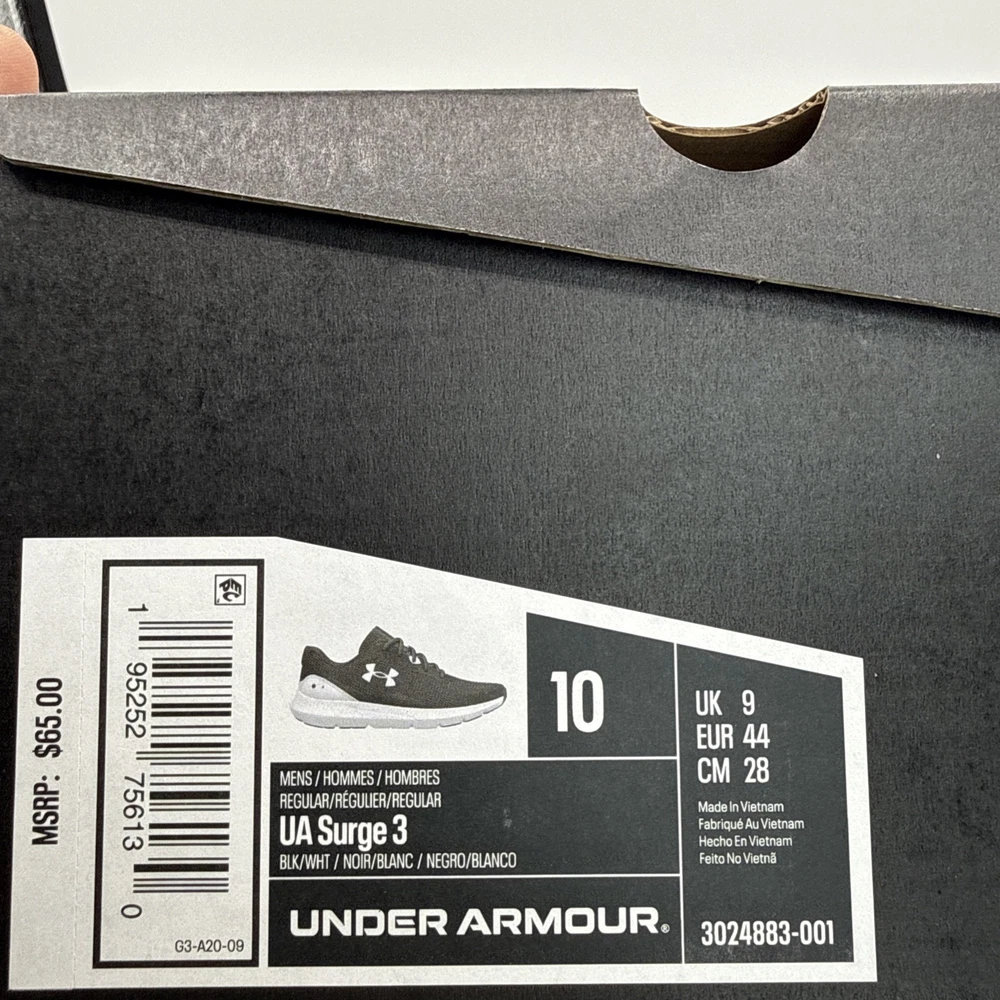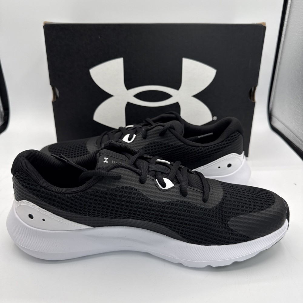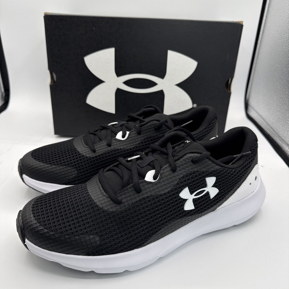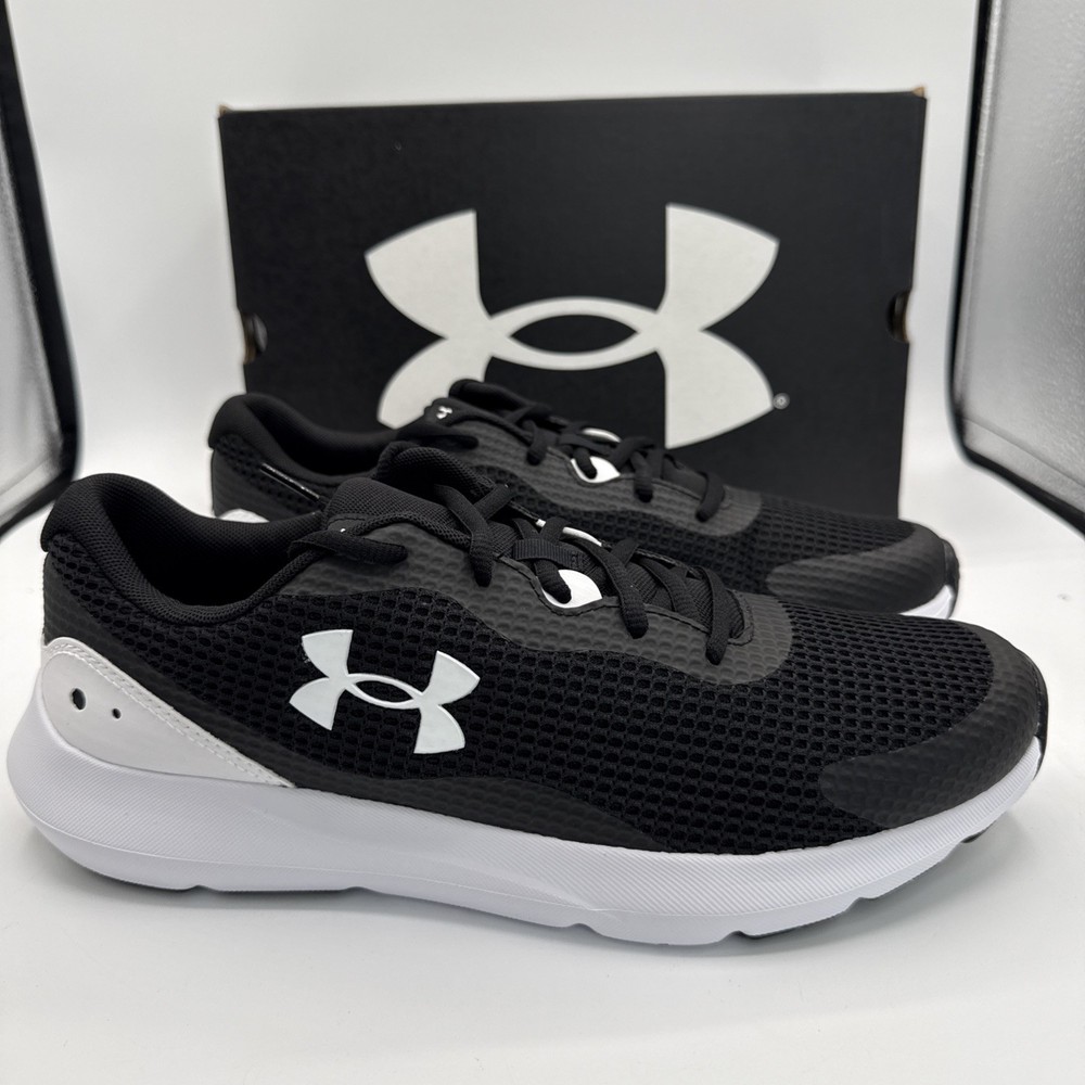 The Under Armour Surge 3 Men's Athletic Sneakers in Black White are designed for running and jogging, with a breathable mesh upper and comfortable foam insole. The low-top silhouette and lace-up closure provide a secure fit, while the rubber outsole offers good traction. These sneakers are suitable for activewear and casual occasions, making them a versatile choice for the summer, fall, and spring seasons. The Under Armour Surge 3 sneakers combine style and performance, making them a popular choice for men looking for quality athletic footwear.