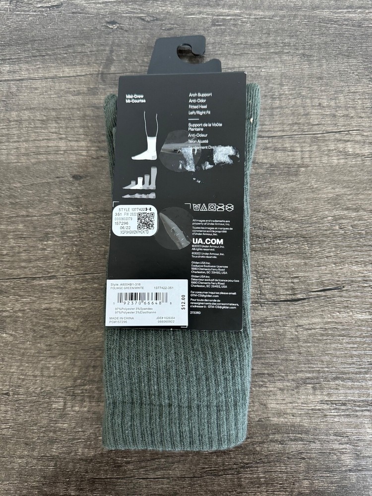 Number in Pack: 1 Pair gtin13: 192370666488 Theme: Outdoor Size Type: Regular Personalize: No Season: Fall, Spring, Summer, Winter UPC: 192370666488 Brand: Under armour Size: men 7-8.5 women 6-10 Style: Crew Socks Occasion: Casual Features: Cushioned Toe Style: Full Toe Pattern: Solid Material: Polyester, Spandex Department: Men Type: Socks Handmade: No Garment Care: Machine Washable Sock Length: Mid Calf Color: Green