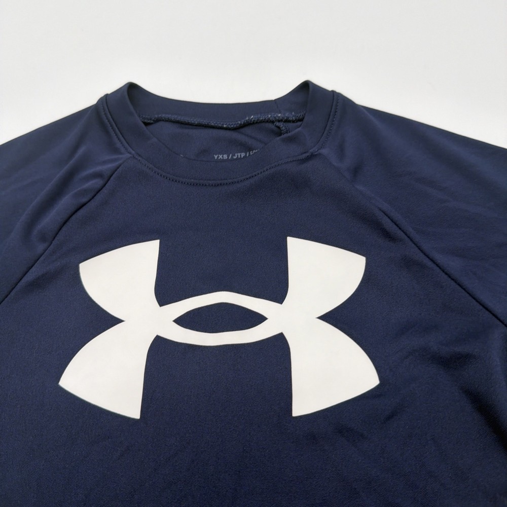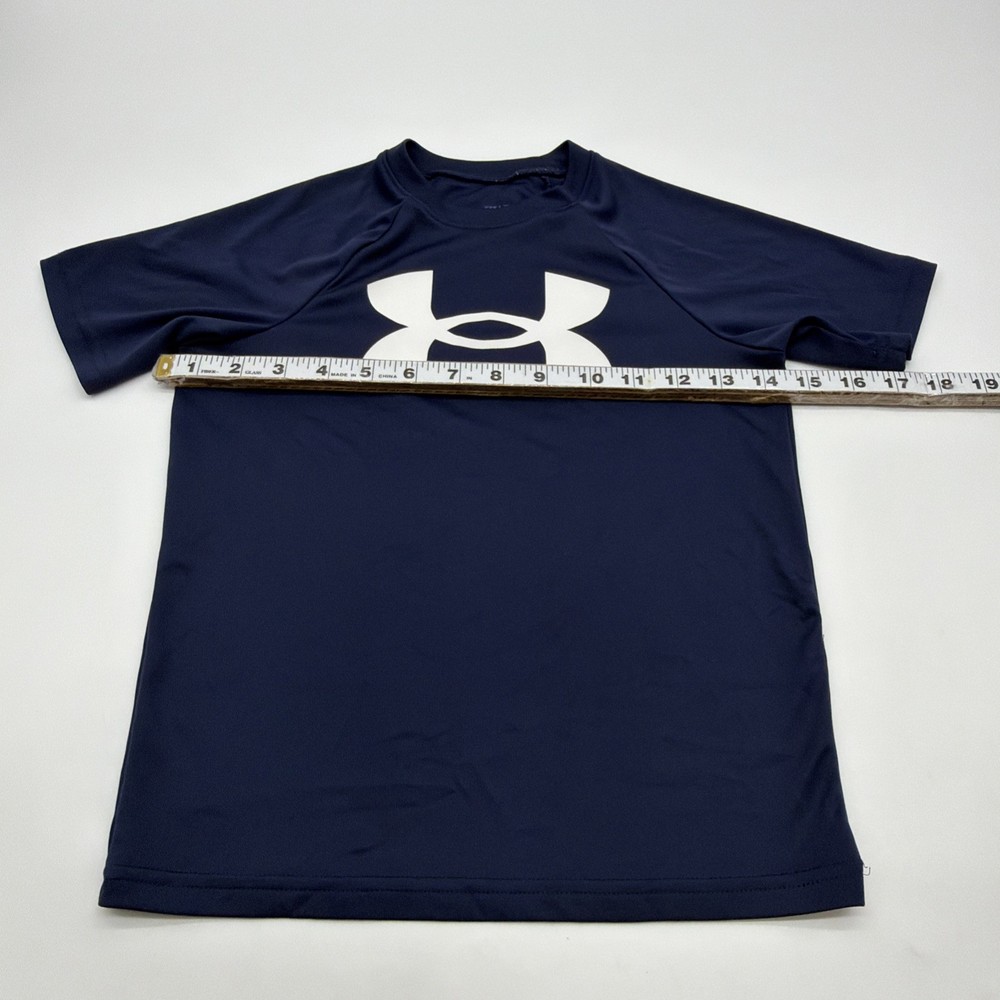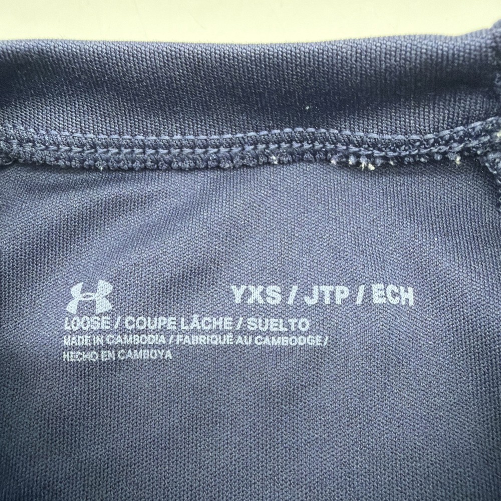 The Under Armour T-shirt Youth Boys XS Blue Graphic Print Logo is a stylish and comfortable option for young boys. Made from 100% polyester, this pullover shirt features a crew neck and short sleeves, making it perfect for various occasions such as travel, activewear, and casual outings. The blue color and graphic print logo add a vibrant and sporty touch, while the athletic fit ensures a comfortable and active feel. Whether for sports activities like basketball or simply hanging out, this T-shirt is a versatile choice for young boys. Check pictures for flaws and measurements