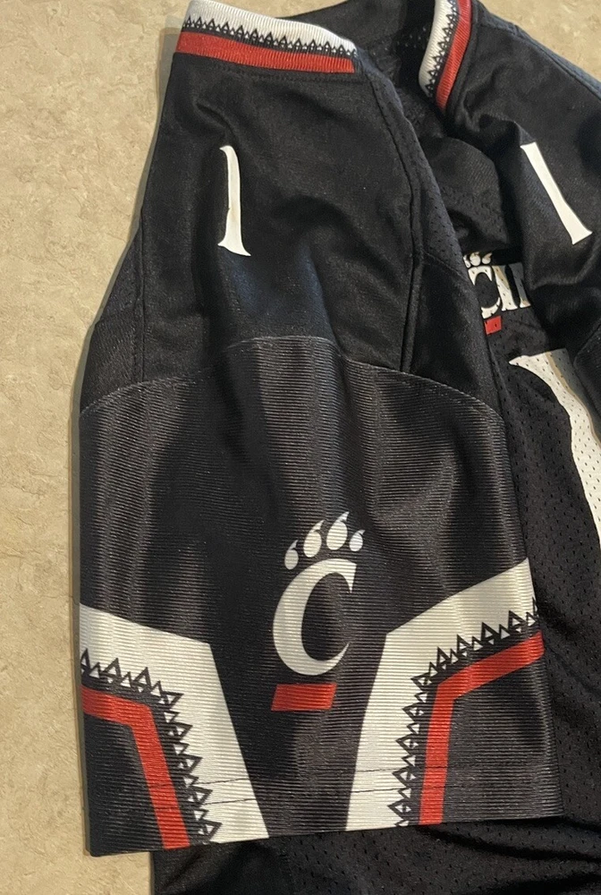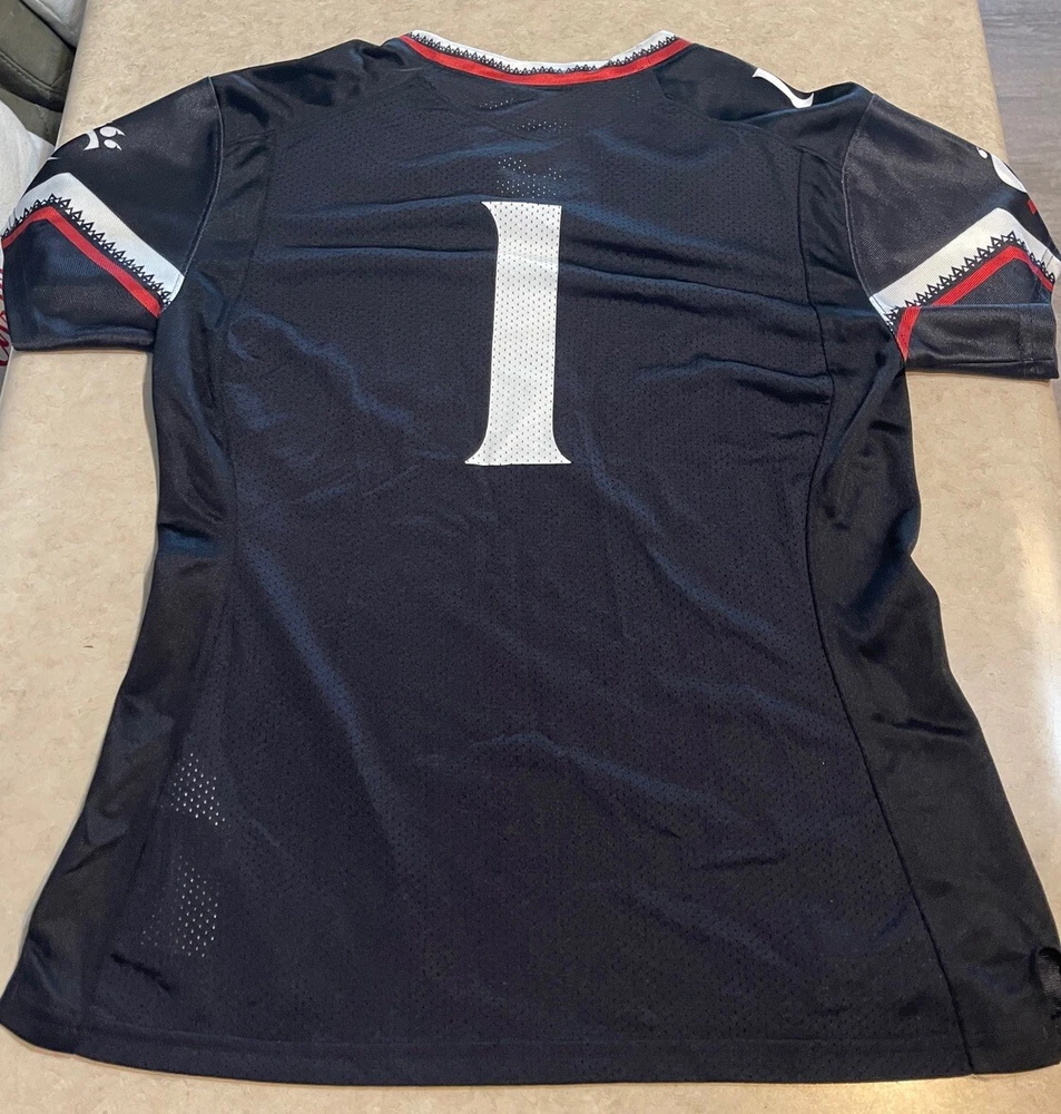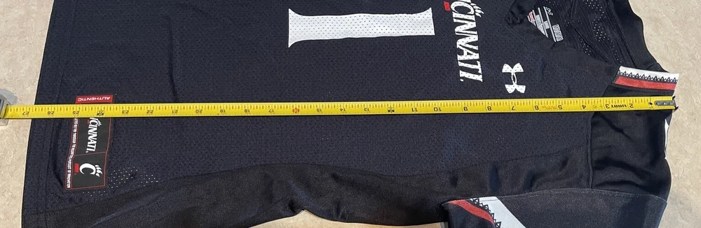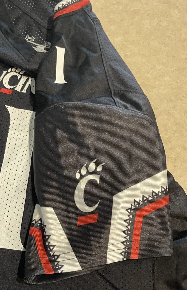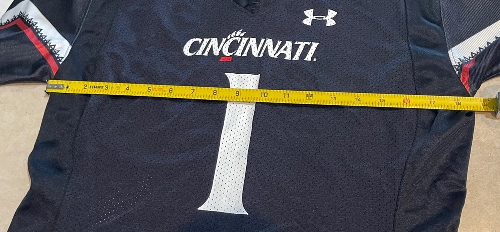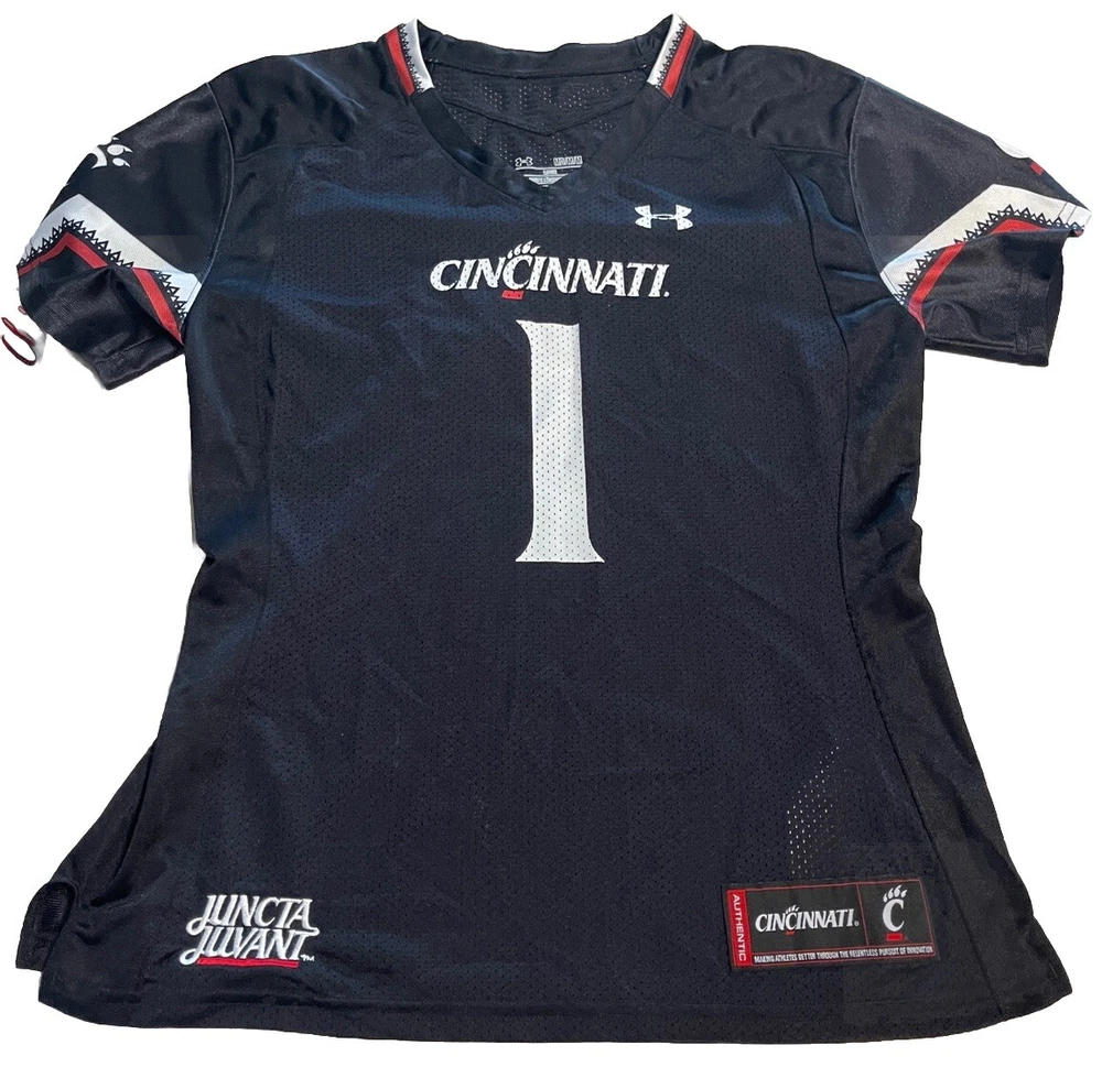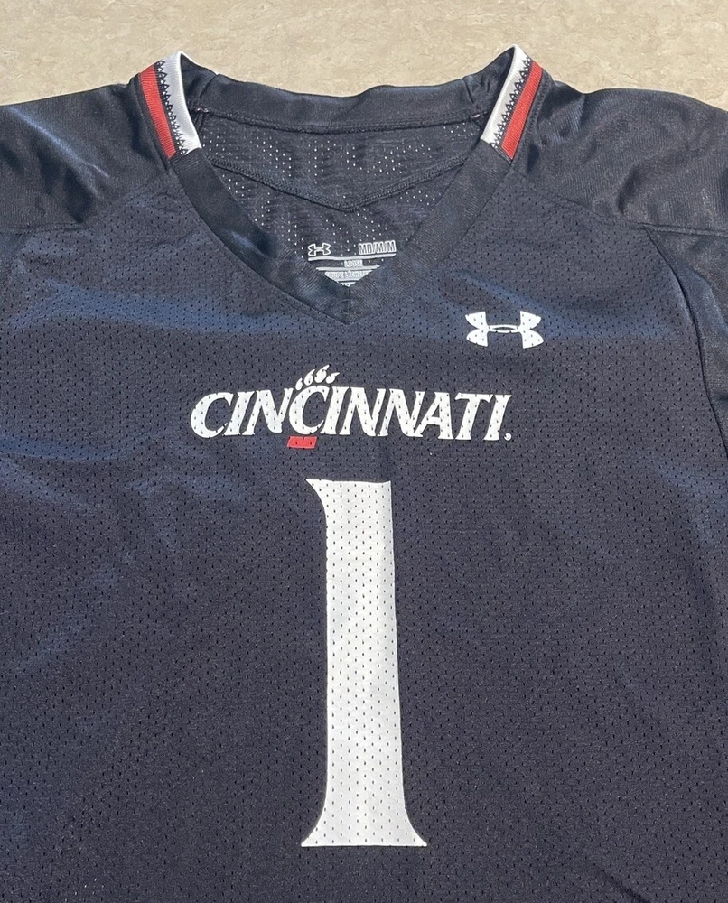 Show your support for the Cincinnati Bearcats with this officially licensed Under Armour UC football jersey. The black jersey features the team's logo on the front and Sauce Gardner's name on the back. It's made for women and comes in a size medium, perfect for fans of all sizes. This jersey is perfect for the NCAA Championship game or any football game, for that matter. It's made in Vietnam and is an authentic Under Armour product. Get yours today and show your love for the Cincinnati Bearcats! This jersey is in good preowned condition with little sign of wear. Please see ALL photos for a better idea on condition, any measurements, or details to the jersey.