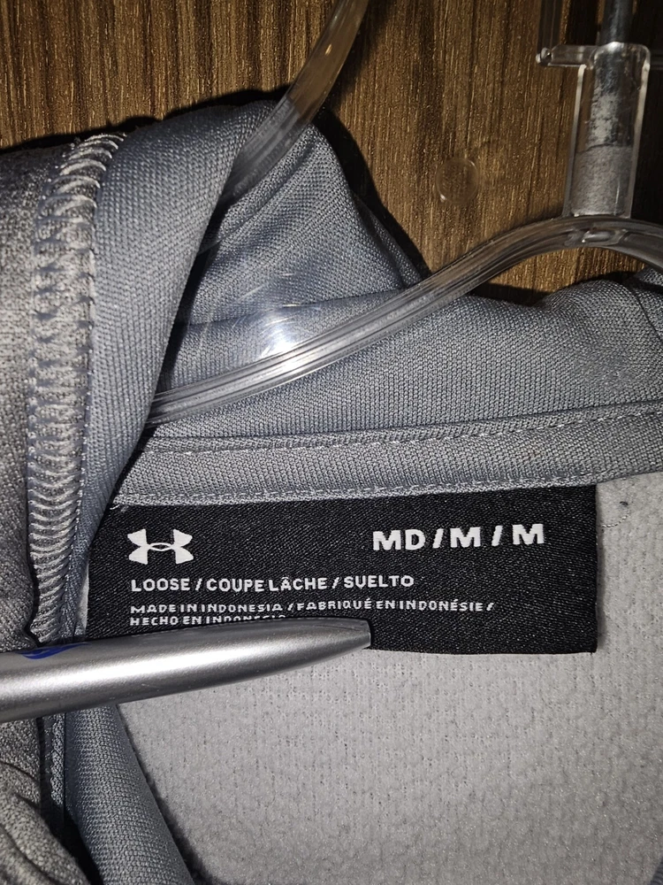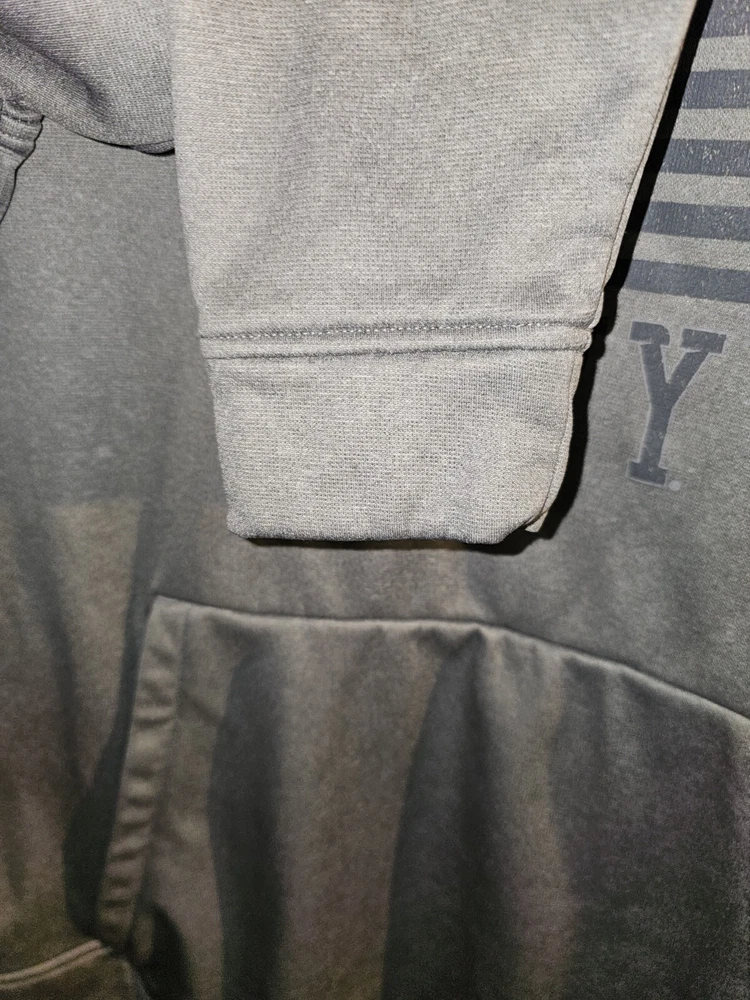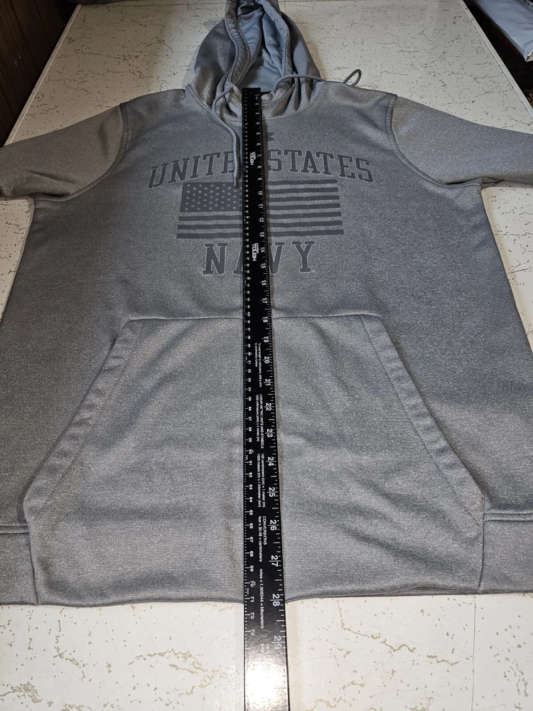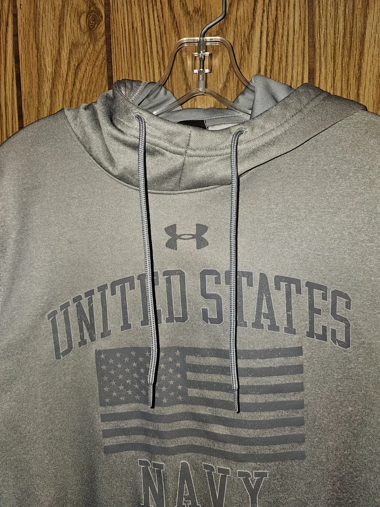 This Under Armour hoodie is a must-have for any activewear collection. Show your support for the United States Navy with the bold graphic logo on the chest. The hoodie is made of high-quality materials to ensure maximum comfort and durability. The gray color is versatile and perfect for any outfit, while the accents of the logo add a unique touch. This hoodie is perfect for women who enjoy an active lifestyle and want to stay comfortable while showing their pride in the Navy.