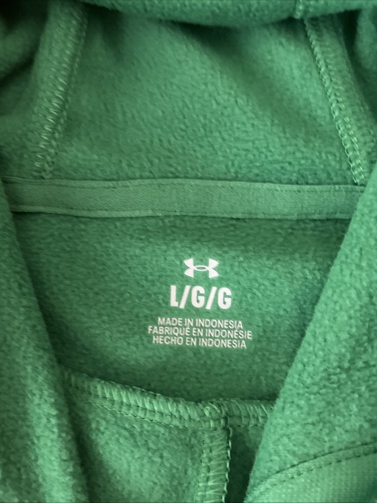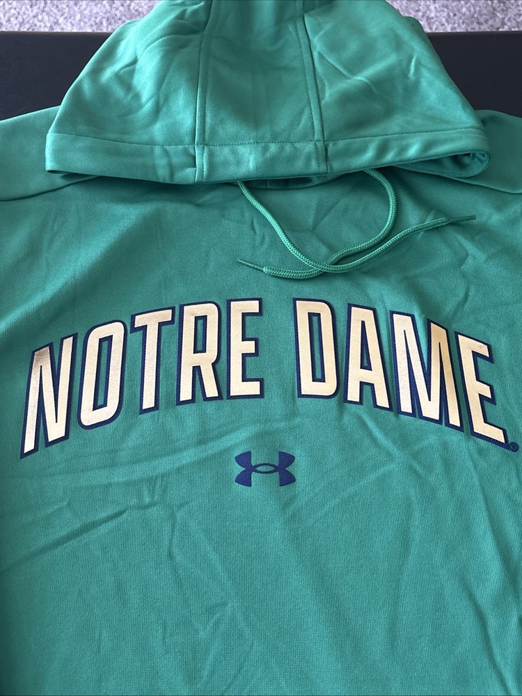 The Under Armour University of Notre Dame Fighting Irish Green Hoodie in size Large is a graphic print pullover hoodie featuring the iconic Irish logo and colors. Made from cozy fleece material, this hoodie is perfect for all seasons and activities such as gym training, walking, or football. With a crew neck, drawstring closure, and hooded style, this hoodie is both comfortable and stylish for any casual or activewear outfit. Ideal for fans of the University and those looking for quality Under Armour apparel.