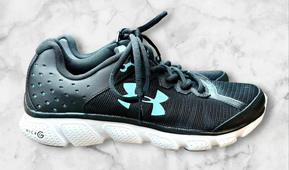 Elevate your workout game with these stylish and comfortable Under Armour Micro G Assert 6 running shoes. Designed with a black and blue color scheme, these shoes are perfect for any outdoor activity, whether it be walking, cross-training, or running. The lace-up closure ensures a secure fit, while the lightweight design provides all-day comfort. Crafted with a synthetic upper material and foam insole material, these shoes are built to last. The rubber outsole provides traction and durability, making them suitable for any surface. With a standard shoe width and low-top shoe shaft style, these shoes are perfect for any woman looking for a comfortable and supportive athletic shoe. EUC