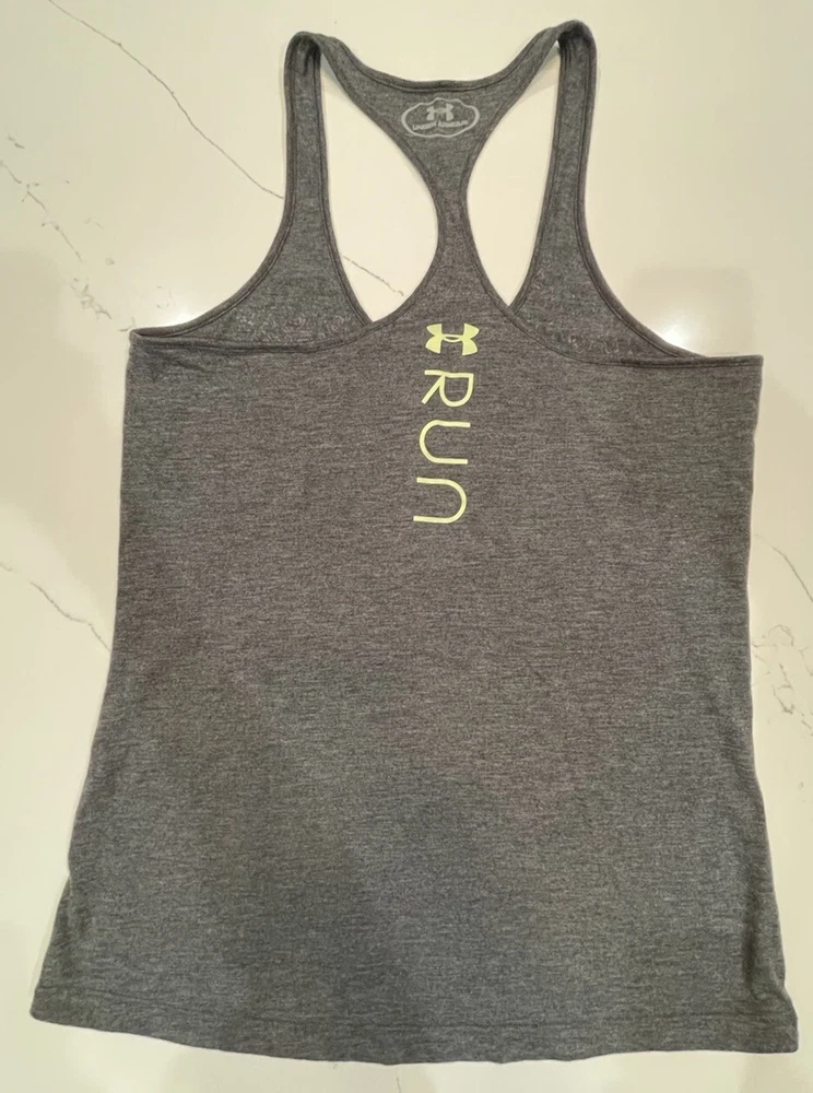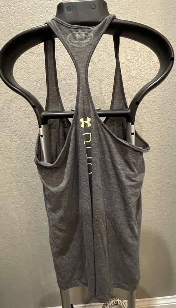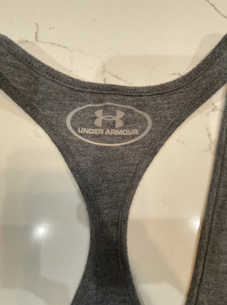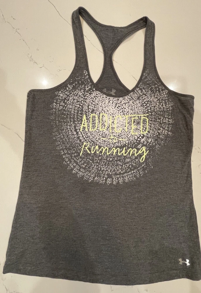 Under Armour Women’s Grey Racerback Tank Top Size “Addicted To Running” No size, but estimated to be a medium.