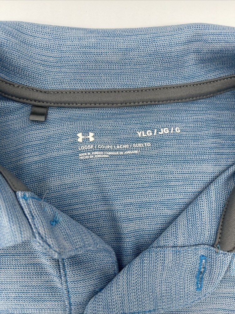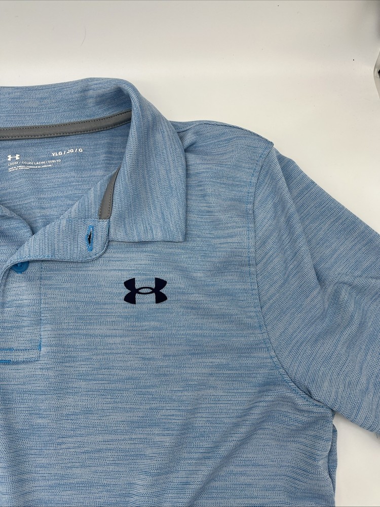 The Under Armour Youth Size Large Polo is a stylish and comfortable top for boys, perfect for casual or activewear occasions. Made of lightweight polyester material, this solid blue polo features a collared neckline, button closure, and short sleeves, making it ideal for the warmer seasons of summer, fall, and spring. The shirt is machine washable for easy care and is adorned with the Under Armour logo, adding a touch of athletic flair. With its regular fit and pullover style, this polo from the Under Armour HeatGear product line is a practical and fashionable choice for young boys.