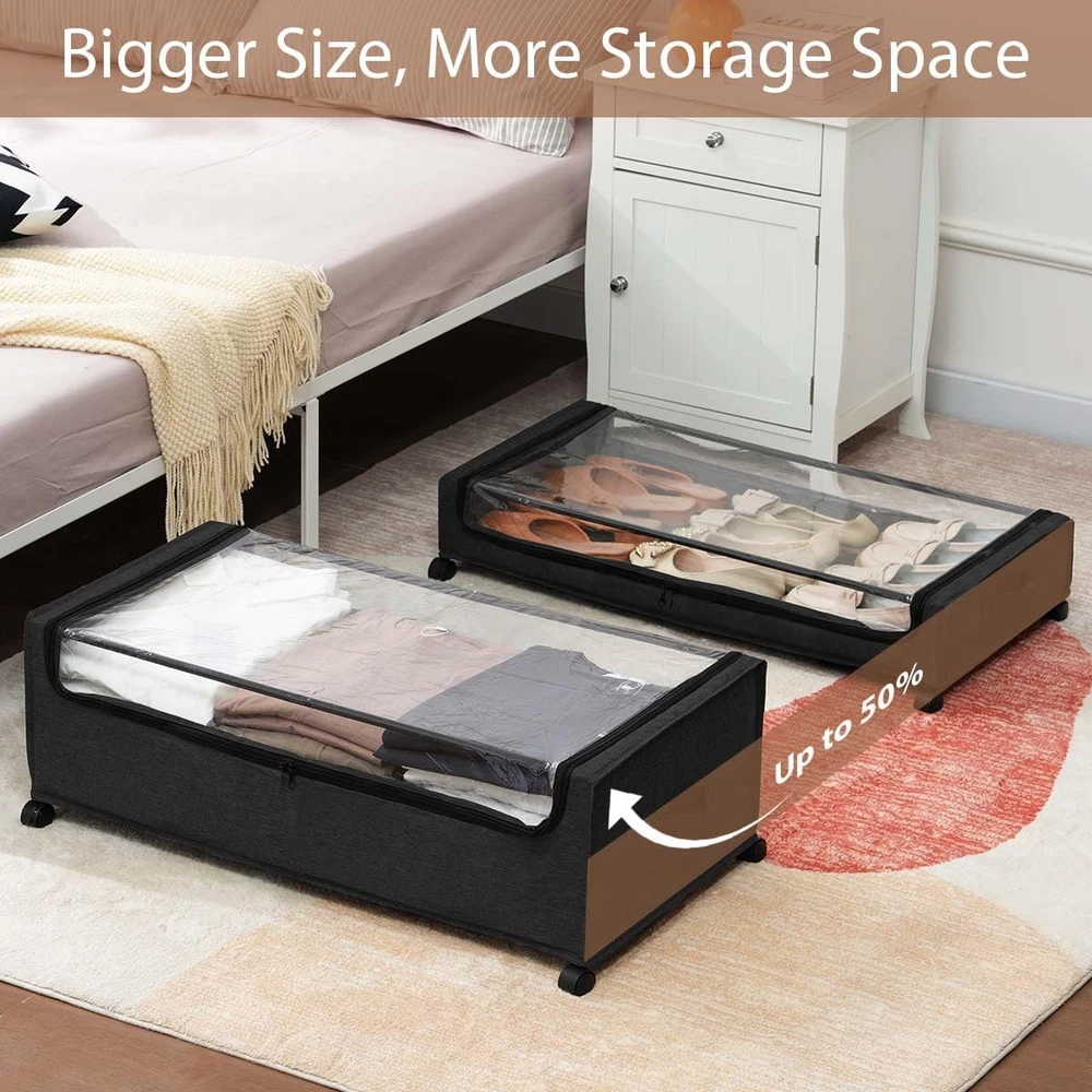 Under Bed Storage with Wheels 2-Pack, XXXXL Size 90L, Rolling Under Bed Storage Containers with Lids, Lockable Wheels, Underbed Drawers for Clothes, Shoes, Blankets, Dorm Bedroom Organizer 【Bigger Size, Large Space】 Our underbed storage have 100% more usage space than others in the market. Quadruple Size allows you to have more storage options and save more space. 【Lockable 360° Wheels】Glide under bed storage with wheels across floors 4 smooth-swivel casters (2 lockable). Secure it in place under beds, sofas, or closets, ideal for nursery storage or any household items. 【Quick Assembly】Optimized structural design and comprehensive installation tools, install in 30 minutes with clear instructions. The 2-pack set offers double the space-saving flexibility for dorms or homes. 【Clear Lid Design】The under bed drawers with lids features a transparent top and dual zippers. Instantly view contents like shoes, or bedding without unzipping, while dust-proof fabric keeps items fresh 【Reliable 2-Pack】100% increased capacity, a 2-piece storage set that provides more space for your household organization.Make home storage simpler and more enjoyable.