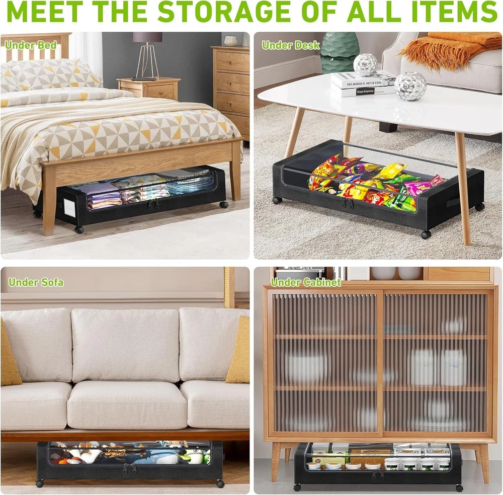 Under Bed Storage with Wheels, XXL 60L Under the Bed Storage Bins, Underbed Storage Containers with Lids & Label, Rolling Metal Drawer for Shoes, Clothes, Books, Toys 2-Pack Black đŠăLarge capacity & quality materialsă Under Bed Storage with Wheels is designed to be x x inches (with wheels), can hold 60L, and is suitable for under bed height > inches; Using high-quality 600D Oxford cloth and a sturdy metal frame, it can carry up to 72 pounds, which is stronger than other ordinary fabric and wire mesh structures. The spacious capacity is filled with heavy objects such as clothes, shoes, toys, books, etc., still strong and stable, and very durable. đă360° Rotating Wheelsă Under the bed Storage Organizer is equipped with 2 side handle and 4 smooth 360° universal wheels that glide effortlessly on various surfaces, making it ideal for use in bedrooms, living rooms, dormitories, shoe cabinets, basements, lofts and other places. By removing the metal frame and wheels at the bottom, the under bed storage bins can be placed flat on top of or inside the wardrobe. đ ăTransparent lid and labelăOur under-bed storage bins with transparent LIDS and labels make it easy to quickly identify your locker contents without having to open the bin, preventing misplacement and eliminating the hassle of searching for items. The under the bed storage box adopts double zipper design and high-quality material to thoroughly keep out moisture, oil stains, dust and dirty things, ensuring that your items are clean and no longer messy. đ§©ăMultifunctionăThis multi-functional storage box can be placed in bedrooms, living rooms, dormitories, shoe cabinets, basements, attics and other places, but also college dormitory storage necessities. It can be placed under beds, sofas, tables, closets, furniture, etc., and is perfect for organizing miscellaneous items such as clothes, shoes, and toys. It is definitely a good helper in your home life. đ ïžăEasy to installăOur under bed storage with wheels can be set up in 30 minutes and come with a friendly product manual to make installation easier. We have a strong after-sales service SATISFACTION GUARANTEE, any product problems please contact me.