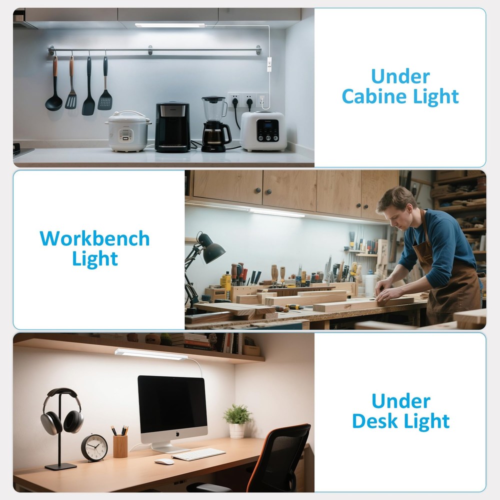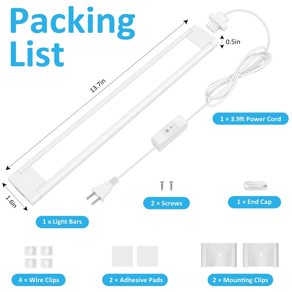 Under Cabinet Lighting Plug in 1 Pack Ultra Bright & Energy Saving: Provide powerful 6000K daylight brightness with low energy consumption, these under cabinet lights plug in are perfect for kitchen counters, closets, workbench, and office desk. LED design ensures long lifespan and saves up to 85% energy compared to traditional lighting Easy ON/OFF Switch Design: Equipped with a convenient inline switch, these cabinet lights with plug allow you to turn on/off instantly without bending or complicated controls. Ideal for seniors, families, and daily kitchen lighting needs Two Connection Methods – Flexible Installation: Linkable design supports two ways to connect: use the 4.9ft connection cable for wider spacing or the direct connector for seamless installation. Easily extend multiple LED under counter lights to cover a large area Two Mounting Options – Adhesive or Screws: Comes with strong adhesive pads and mounting clips with screws, giving you two simple installation methods for under cabinet lighting. No need for electricians, install in minutes under cabinet, shelf, or workbench Versatile Applications – Kitchen, Workbench & Office: This linkable under cabinet light bar kit is not only perfect for kitchen cabinet lighting, but also great for workbench, office desk, laundry room, or reading space. Slim design hides easily while providing bright and even illumination