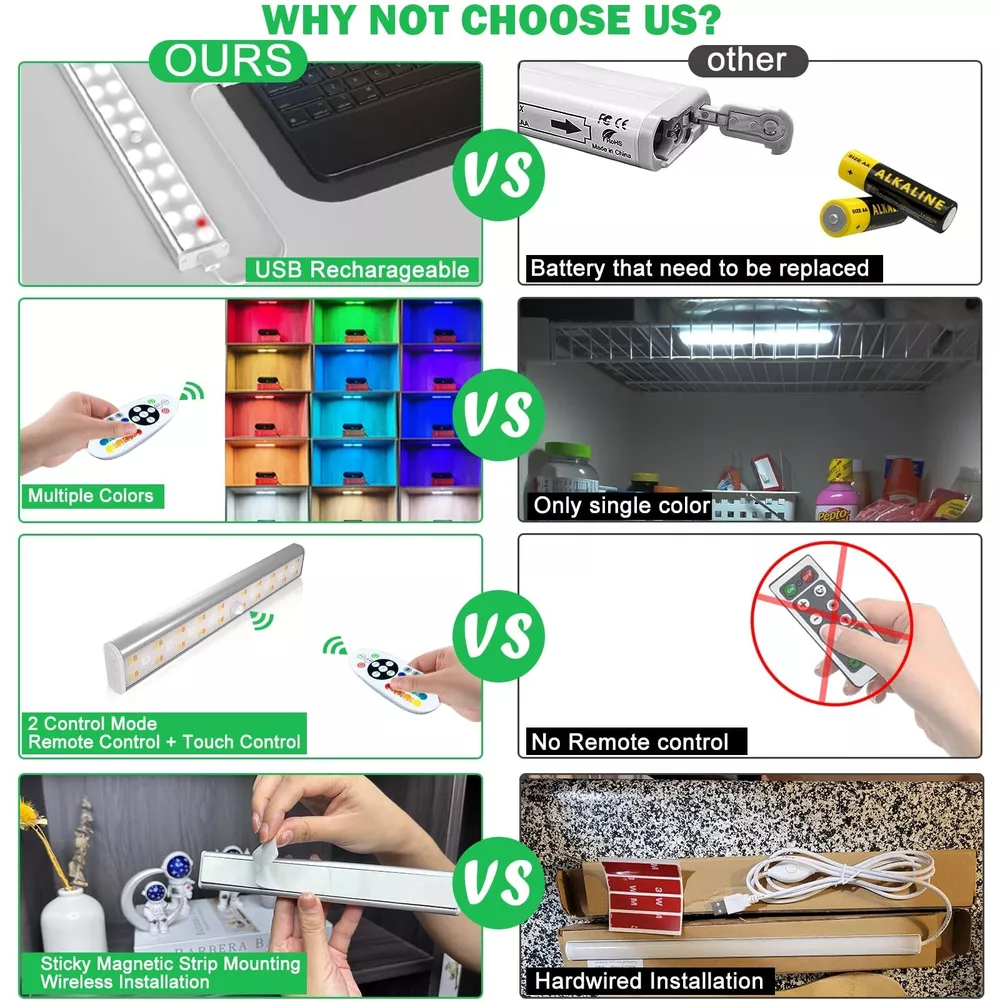 Under Cabinet Lights Wireless, Dimmable 48 LED Closet Lights Rechargeable, Under Counter Lighting with Remote, 15 Color Changing Night Light RGB Bar for Home Shelf Kitchen Pantry Stair, 4 Pack Description: Features: 15 Colors & 4 Dynamic Modes: 4 packs of RGB under cabinet lights wireless are available in 15 different colors (12 RGB colors and 6000K/4500K/3000K), measuring 7.5" L x 1.2" W x 0.6" H, The high brightness can reach 160 lumens. In addition to being able to be used as ambient light and emergency lighting, it can also be used as a mood light. 4 color changing modes - Flash, Strobe, Fade, Smooth. 12 RGB colors flash in a loop, you can use them together in different areas to create a fun mood. Remote Control Cabinet Light: Each set comes with 1 remote control, remote control can easily operate multiple lights within 10-15 feet range. Convenient and time-saving, the remote control has functions such as switching lights, color changing, dimming, timing, etc. In "ON" mode, the remote control can be used, and in "OFF" mode, the power is off. (Warm Tip: The wireless cabinet lights no induction function). USB Rechargeable & Super Easy to Install: Wireless LED closet light built-in 3.7V 1100mAh rechargeable battery, no need to replace battery, save power and money, it takes 2-3 hours to fully charge. After full charged, it can be last 8-9hours in RGB mode (In ON mode: 7-8H). Under cabinet lighting is equipped with sticky magnetic strip, remove the tape and stick it on any clean surface, easy to install, no screws or wires required, is a good choice for temporary and permanent installation. Dimming & Timing: The best choice for bedroom night lights, 10-level of brightness (10%-100%), low brightness to meet the brightness needs of your sleep, high brightness to meet the brightness you need for work, under-counter lights fixture can be set to auto-off after 30, 45 or 60 minutes, if you do not want to set the timer, press the CANCEL key to cancel all timer settings, and you don't have to worry about forgetting to turn off the cabinet lights even if you fall asleep or go out. Widely Use & Guarantee : We provide Lifetime quality assurance, if you have any questions about our products, please feel free to contact us, we will reply you within 24 hours. This rgb led under cabinet lighting is perfect for your cupboard, closet, cabinet, stairs, bedroom, kitchen, pantry, bookcase, bathroom, hallway, stairs, basement, garage, pantry, stair, workshop, storage, shelf, bookcase, display cabinet, wardrobes, etc. Product Details: Brand: LAJOSO Color: 12 RGB Color & 6000K/4500K/3000K Material: Aluminum Style: Remote Control Lights/ 4 Pack Light fixture form: Sconce Brand: LAJOSO Color: 12 RGB Color & 6000K/4500K/3000K Material: Aluminum Style: Remote Control Lights/ 4 Pack Light fixture form: Sconce Room Type: Living room, Cupboard, Closet Light, Bookcase Lighting, Wardrobes, Cabinet, Closet, Stairs, Display Cabinet, Kid's Room, Garage, Workshop, Storage, Shelf, Bookshelf, Stairway, Pantry, Party, Entryway, Kitchen Lights, Bathroom, Basement, Bedroom, Hallway, Product Dimensions: 7.28"L x 1.18"W x 0.59"H Specific Uses For Product: gun safe light, tap light, rechargeable under cabinet lighting, under counter lights for kitchen, home, cabinet lights, stick on lights, kitchen cabinet lights Indoor/Outdoor Usage: Indoor Power Source: Built in 1100 mAh Rechargeable Lithium Battery Installation Type: Magnetic strip Special Feature: Indoor Use Only, Under Counter Lights for Kitchen, Wireless Under Cabinet Lights, Under Cupboard Lighting, LED Strip Lights with Remote, Rechargeable Closet Light, 15 RGB color night light bars, Dimmable, Portable, Color Changing, Portable, Adjustable Color Temperature, Multi Colored Under Cabinet Lights Control Method: Remote Light Source Type: LED Finish Type: Polished Shade Material: Aluminum Number of Light Sources: 48 Voltage: 5 Volts Light Color: 6000K White light, 3000K Warm light, 4500K Natural light, 12 RGB colors Shape: Straight Included Components: 1 x remote control, 1 x user manual, 4 x charging cables, 4 x magnetic strips, 4 x wireless under cabinet lights Warranty Type: Lifetime Lighting Method: Adjustable Brightness Item Weight: 16 ounces Number of Items: 4 Wattage: 2 watts Controller Type: Remote Control Switch Type: remote control/touch control Unit Count: 4.0 Count Water Resistance Level: Not Water Resistant Brightness: 160 Lumen Mounting Type: Double-sided adhesive magnetic strip paste Fixture Type: Removable Assembly Required: No Manufacturer: LAJOSO UPC: 712215624765 Model Name: RD10 4 Pack Part Number: RD10 Item Weight: 1 pounds Country of Origin: China Item model number: RD10 Batteries: 1 Lithium Ion batteries required. (included) Size: Remote Control Lights 4 Pack Finish: Polished Plug Format: ac Special Features: Indoor Use Only, Under Counter Lights for Kitchen, Wireless Under Cabinet Lights, Under Cupboard Lighting, LED Strip Lights with Remote, Rechargeable Closet Light, 15 RGB color night light bars, Dimmable, Portable, Color Changing, Portable, Adjustable Color Temperature, Multi Colored Under Cabinet Lights Batteries Included?: Yes Batteries Required?: Yes Battery Cell Type: Lithium Ion Average Battery Life: 50000 Hours Warranty Description: 1 year. Date First Available: March 9, 2022 On Nov 20, 2024 at 19:55:28 PST, seller added the following information:
