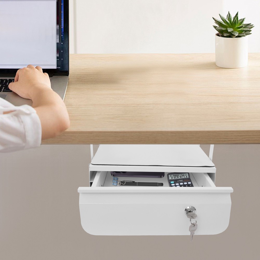Have a nice day~ Description This sliding pull-out drawer is very suitable for use in offices and study rooms. Premium material and exquisite workmanship ensure its beauty and durability. The pull-out design makes accessing files and items simple and convenient, and the locking design can better protect your privacy. Its large size provides enough space to organize your items and keep your office and study environment tidy. With it, you will enjoy a more convenient life. Key Features Last for Years: It is made of premium steel with welding and painting processes, which is scratch-resistant, abrasion-resistant, rust-resistant , and sturdy, ensuring aesthetics and long-term use. Excellent Organizer: The 11.5*14.3-inch large drawer, top additional platform, and 4.4 lbs proper load capacity provide enough space and ability to store various files and items. Space Optimization: Its under-desk mounting method utilizes the under-desk space cleverly to expand the storage space to keep your desktop clean and organized. User Friendly: The smooth sliding device and embedded handle design allow you to pull out the drawer easily and quietly, making it more convenient to access items. Moreover, the lockable design can better protect your privacy, ensuring the security of your personal belongings and confidential documents. Simple Installation: With complete accessories and a simple structure, you can easily install it and put it into use quickly! Easy to Clean: It has a simple construction and smooth surface, so you can wipe the stains off its surface with a damp rag. Ideal Gift: Thanks to its practicality and beauty, you can give it to your friends as a Christmas or housewarming gift! Modern Appearance: The simple and elegant style, as well as the classic white color, make it compatible with various drawer styles and enhance the overall beauty. Details Rounded Corners: This design is comfortable to touch, can care for your skin, and enhances the design of this product. Spare Key: It has two keys and you can use one as the spare key for emergency use. Rubber Pad: It can effectively prevent slipping and improve the safety of item placement. Application It is installed under the tabletop and can store various items, such as books, iPads, phones, pens, pencils, glue, erasers, adapters, earphones, cosmetics, or other small items used regularly. It fits both standing desks and standard fixed-height workstations. Specification Color: White Shape: Rectangular Material: Steel, Rubber Process: Welding, Painting Assembly Required: Yes Mounting Type : Under Desk Applicable Min. Desktop Thickness: 20mm/0.79in Load-bearing Capacity: 2kg/4.4 lbs Desk Bottom to Drawer Top: 8.38cm/3.3in Each Mounting Bracket Length: 17.78cm/7in Each Mounting Bracket Height: 18.3cm/7.2in Installed Bracket Spacing : 33.27cm/13.1in Drawer Size(L*W): 29.21*36.32cm/11.5*14.3in Package Size: 38.5*32*6cm/15.16*12.6*2.36in Gross Weight: 4.7kg/10.36 lbs Net Weight: 4.2kg/9.26 lbs Package Included 1* Under Desk Pull-out Drawer 2* Keys 1* Pad 2* Mounting Brackets Other Accessories for Assembly Notes Please measure your desk size before purchasing. Please ensure that your desk can support the total weight of the drawer and its load capacity. Please allow the slight color difference caused by the shooting light and 1-3cm error due to manual measurement and make sure you do not mind before ordering. Payment Delivery details Terms of sales About us Contact us Payment We accept ebay payment 。 Fees such as import duties, taxes are not included in the item price or shipping costs. These charges are the buyer's responsibility. Delivery details Shipping: 2-9 working days to: USA Terms of sales We maintain high standards of excellence and strive for hundred percent customer satisfaction. Feedback is very important to us. We hope that you contact us immediately before you give neutral or negative feedback, so that we can address your concerns. It is impossible to address issues if we do not know about them! About us Your satis faction is our ultimate goal. We work hard to earn your trust and future business. Our certified technicians have tested each item before shipping. The unit comes with 1 year limited warranty on all manufacturing defects. a) If you receive a defective item, you may return it or ask for a discount. Please contact us within 14 days after you receive the package. b) What you returned must be intact and in its original packaging as re? u. Customer is responsible for shipping costs of the returned item. c) We will cover the cost of shipping back t with the shipping rate indicated in the registration page. We will send you a new unit or refund the full payment you paid. Thank you. Contact us Business Hour Business Hour: Monday To Friday: 8:30 AM to 5:00 PM (Beijing China time) Due to time zones, our reply to your questions may not be immediately. But within above working time, we will reply your email within 24 hours. If it's non-workdays, please kindly be patient and wait till Monday. Please contact us with ebay message. Please feel free to contact us if you have any questions. Monday To Friday: 8:30 AM to 5:00 PM (Beijing China time) Due to time zones, our reply to your questions may not be immediately. But within above working time, we will reply your email within 24 hours. If it's non-workdays, please kindly be patient and wait till Monday. Please contact us with ebay message. Please feel free to contact us if you have any questions.