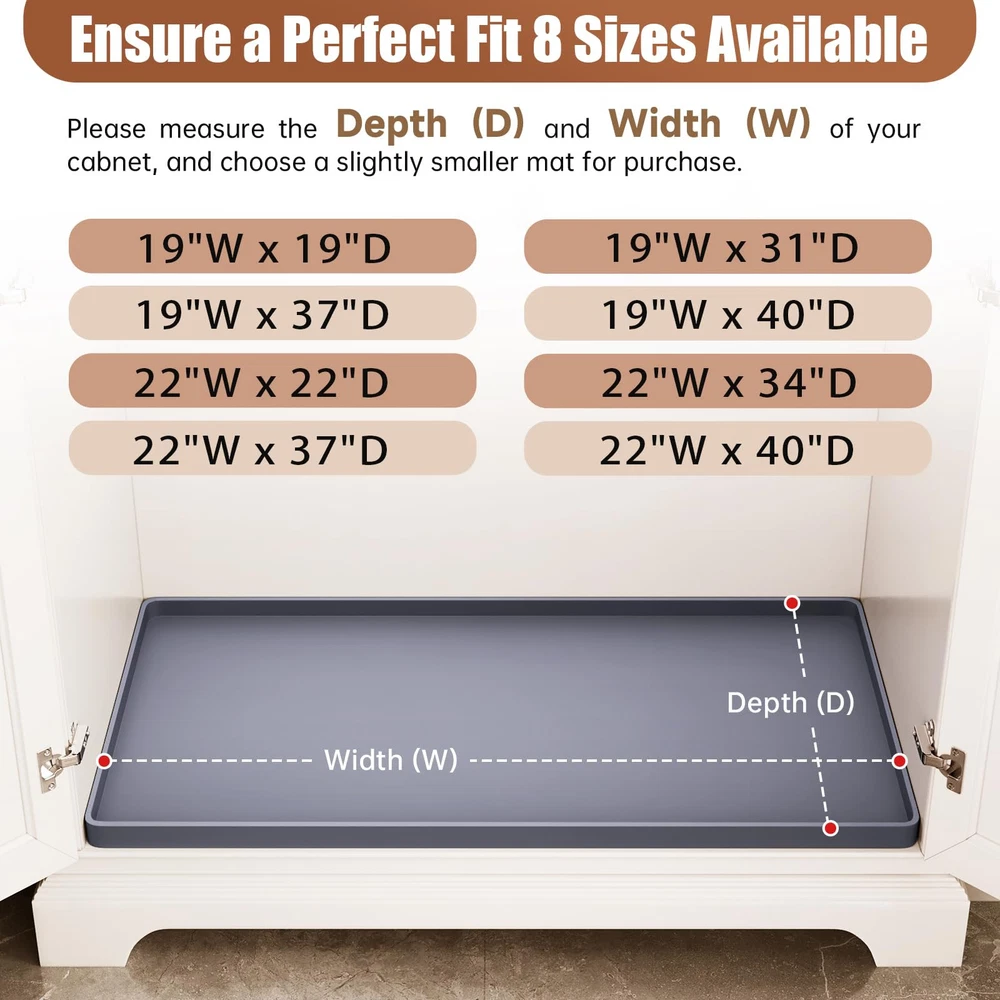 High quantity Mat: Waterproof, Stain-resistant, wide range of applications. Choose Under Sink Mat for your home ! How to Choose the Right Size Mat? 1.Please measure the width and depth of the inside of your cabinets. If you can't get the exact values, it’s recommend to choose a slightly smaller size. 2.If you have any other questions about the sink mat, please feel free to contact us. Provide other size in our store ● 22 x 19 inch ● 25 x 19 inch ● 25 x 22 inch ● 28 x 19 inch ● 28 x 22 inch ● 31 x 22 inch ● 34 x 19 inch Excellent Protector: With raised edge design and High quality silicone, our sink mat can hold gallons of liquid, protect your cabinet, shelf and floor from leaks, stains, scratches and keep it tidy and organized; Our sink mats provide the ideal solution for extending your cabinets life! Safety and Durability: new under-sink mat is made of 100% food-grade silicone, you can use it at home with confidence; The thick and soft silicone material makes it waterproof, durable and colorfast, protecting your cabinets for a longer period of time Easy to Install: The mat is soft and easy to fold, you can easily fit it into a variety of cabinet shapes; In order to choose the appropriate size, please measure the length and width of the cabinet before purchasing; If you do not have the exact data, it is recommended to choose a slightly smaller size! Multi-purpose mat: Our sink mat is suitable for multiple areas of your home! First, it's an excellent protector for cabinets; In addition, it can be used as shoe mat, pet water feeding mat, coffee mat, drying mat, and also as sink organizers to keep your home tidy After-Sales: Providing customers with a satisfactory shopping experience is our pursuit. If you encounter problems during the purchase or subsequent use, you can contact us at any time. We will provide you with the best solution within 24 hours; Thanks for choose sink mats!