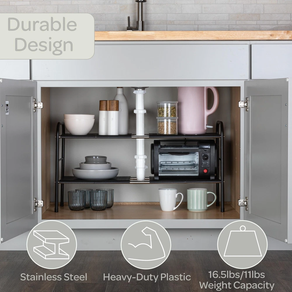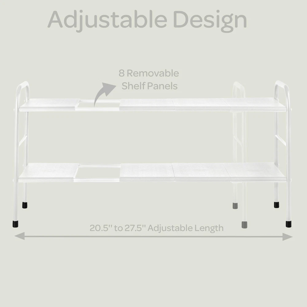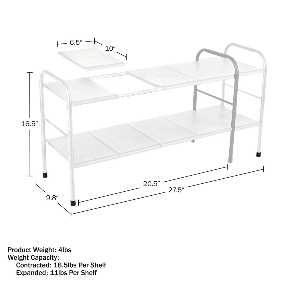The completely customizable 2-Tier Under Kitchen Sink Organizer by turns wasted space into organized storage. With an adjustable length and 8 removable shelf panels, this bathroom cabinet organizer allows for customizable and movable shelving, so interfering with drainpipes isn’t an issue. This cabinet shelf fits under almost any sink or cupboard and is perfect for organizing cleaning products, toiletries, towels, or for creating more space for pots and pans. UNDER THE SINK ORGANIZER - Transform wasted storage space with the under bathroom sink organizers and storage. This under cabinet shelf allows you to increase your kitchen or bathroom storage options by fully utilizing the space under your sink. ADJUSTABLE DESIGN - With an adjustable length from 20.5in to 27.5in and 8 removable shelf panels, the under cabinet organizer fits under almost any sink. The panels allow for completely customizable and movable shelving, so drainpipes aren't an issue. DURABLE CONSTRUCTION - Made of stainless steel and heavy duty plastic, each shelf on this under bathroom sink organizer can support up to 16.5lbs when contracted and 11lbs when extended. The cabinet shelves assemble quickly with hardware included. VERSATILE USE - Use the unit as a kitchen shelf organizer to pots, pans and dishes, or use it as a bathroom sink organizer to cleaning supplies or toiletries, ideal for adding usable under shelf storage space to any sink, cabinet, or cupboard. PRODUCT DETAILS - Materials: Stainless Steel and Plastic. Dimensions: (L) 20.5-27.5” x (W) 9.8” x (H) 16.5”; Panels: (L) 6.5” x (W) 10”. Product Weight: 4lbs. Weight Capacity: When Contracted: 16.5lbs Per Shelf; Expanded: 11lbs Per Shelf. Color: White.
