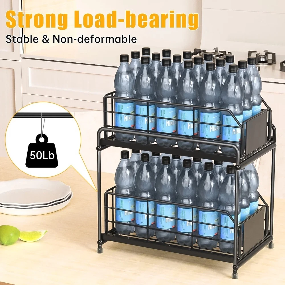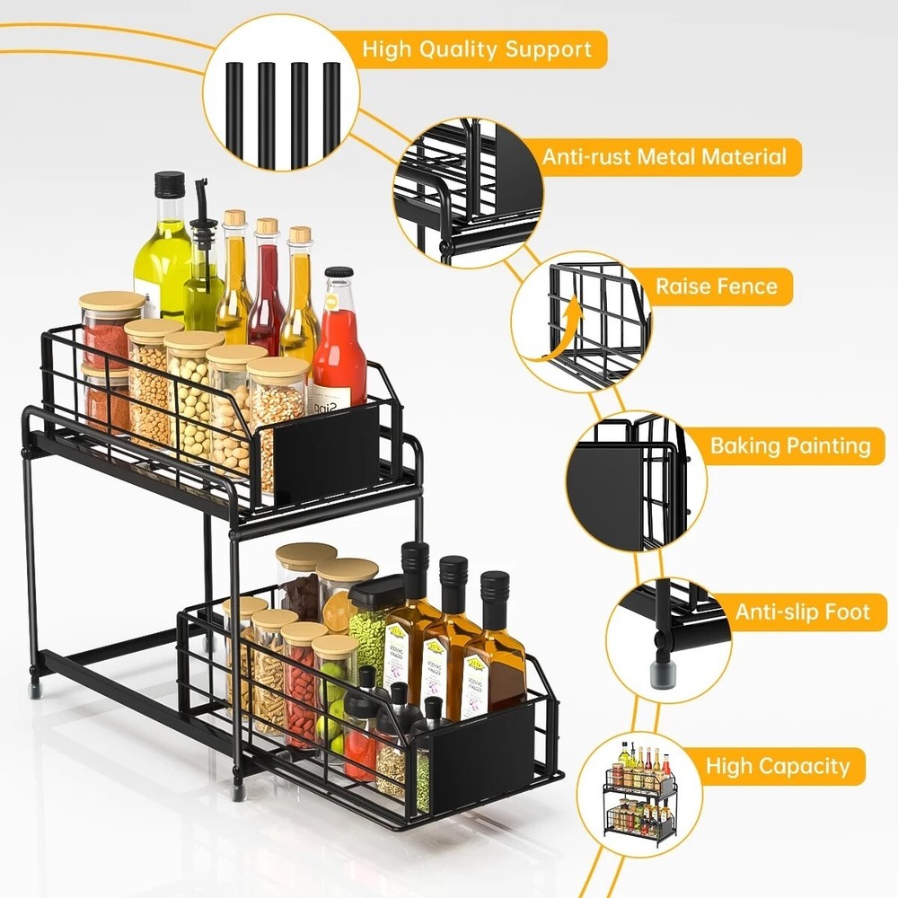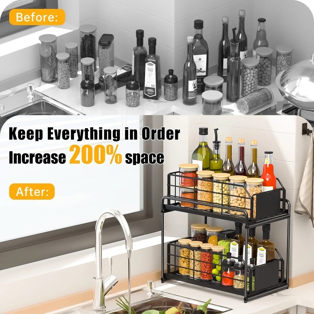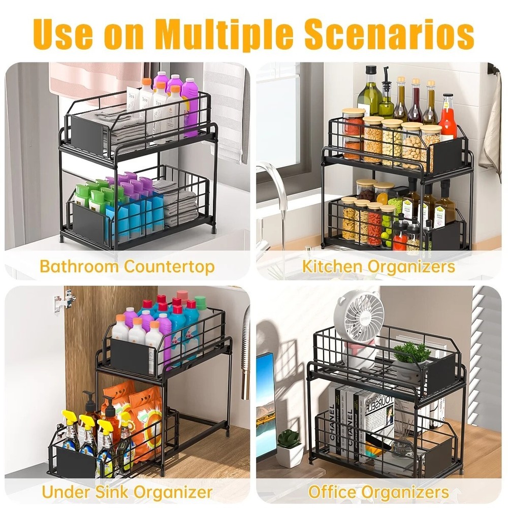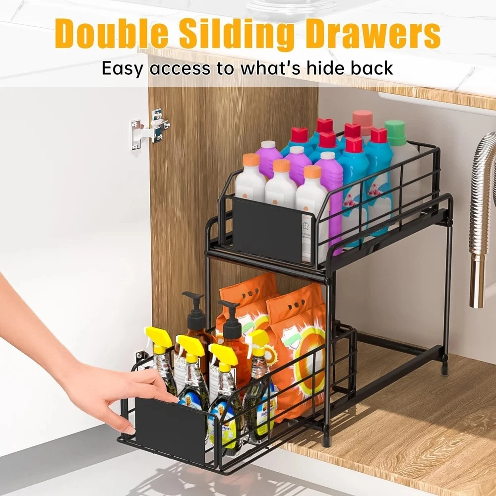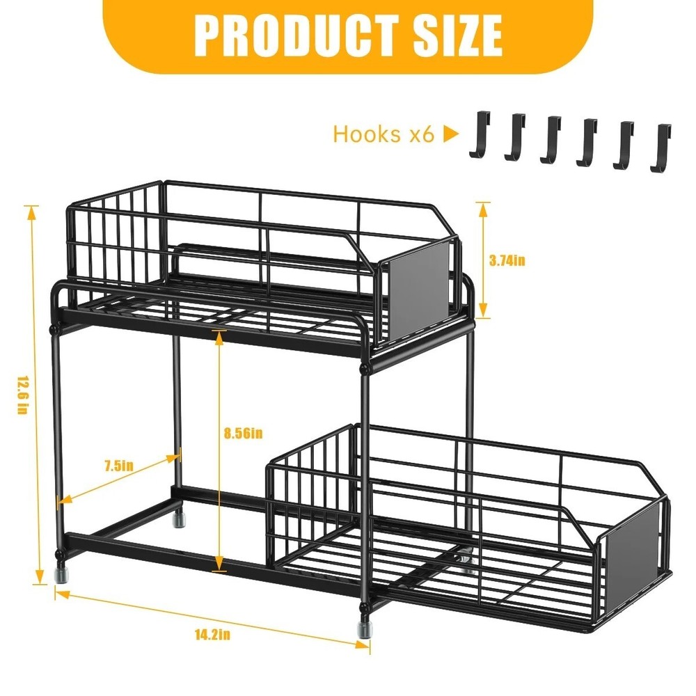 Space Saving Storage Organizer Under sink organizers and storage keep your under sink cabinet, pantry room and counter top etc. organized neatly and maximize space utilization in kitchen, bathroom, garages, laundry rooms, offices and storage room organization. Double Slide Drawers Design Very compact under sink organizers and storage in two levels maximizes vertical space. The bottom sliding drawers can be pulled out by the handles for easy access to items behind the front row. There are 6 little hooks to hang stuff off the unit, effectively using the entire space of the cabinet. Premium Coated Metal Materials Our under sink organizer is made of carbon steel, which is durable and resistant. The baking paint process makes the surface more smooth with good anti-rust and can keep the metallic luster even in the wet bathroom or greasy kitchen, the bottom has 4 rubber feet to protect the surface from scratches. Durable & Stable Ours kitchen organizer is made of high quality steel with anti-rust painting, the thickened steel can hold up to 50 lbs. 4 non-slip foot is to prevent it sliding or scratching. Wide usage Organizer This stunning storage rack is as functional as it is aesthetically pleasing. Perfect for bathroom, kitchen, living room, office. It can be used as a under sink organizer, bathroom storage, cosmetic storage standing shelf, kitchen spice rack or separate from 2 layers to a tray, perfect for holding glasses, plates, bowls, etc. Specification Color:Black Material:Metal Product Dimensions:12.6"L x 7.5"W x 14.2"H Shelf Type:Sliding Shelf Room Type:Bathroom,Kitchen, Undersink Under sink organizers and storage makes cabinet look neat and organized, you don't need to waste time fumbling around products, which can help you find everything you need at a glance. Under sink organizer is made with quality Coated Metal, the double tier level is held up by thickened rods, strong and durable. The baskets with hollow design for good drainage. Easy to clean, just wipe the surface with a damp cloth. Cabinet organizer dimension is 12.6"L x 7.5"W x 14.2"H. The distance between the two shelves is 8.56". The bottom area can hold bottles up to 8 inches high, enough for storage in most bathrooms or kitchens. Please make sure to measure before ordering.The user-friendly pull out cabinet storage installs quick with no experience necessary. 【Effortless Setup & Stable Structure】Our under kitchen sink organizers and storage can be easily installed according to the instructions. Compared to other under sink organizers and storage that do not secure the bottom, our under sink organization feature a firmly screwed base, ensuring stability without wobbling. Made of high quality steel, can bear 50 lbs. With baking paint, beautiful and rust-proof. Sink shelf is grid design to prevent water accumulation; 2 pads to prevent objects from falling, removable and washable. Features Slide-Out Brand GPED Manufacturer Part Number GP-UO-02 Manufacturer GPED Color Black Assembled Product Weight 4.5 lb Assembled Product Dimensions (L x W x H) 14.20 x 7.50 x 12.60 Inches