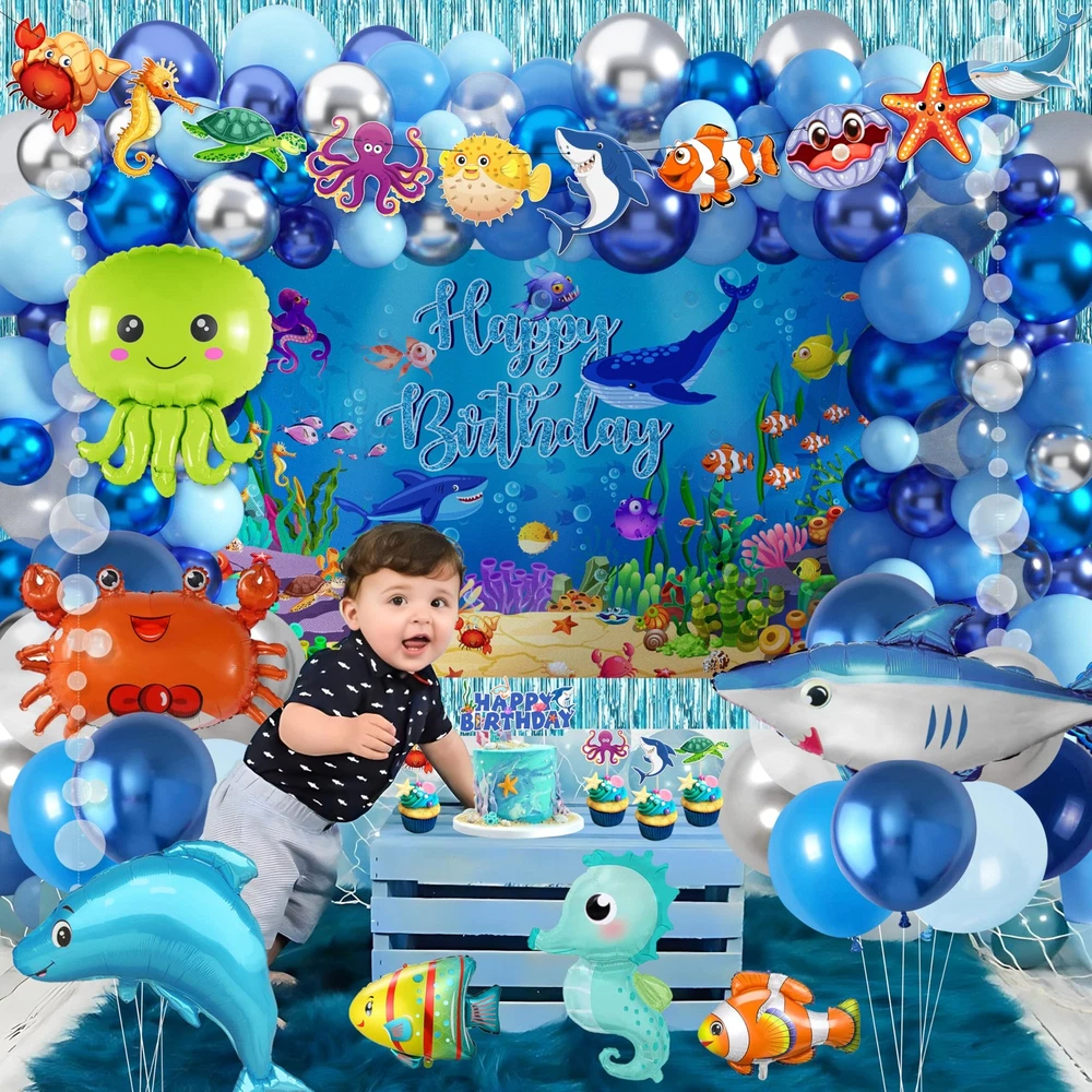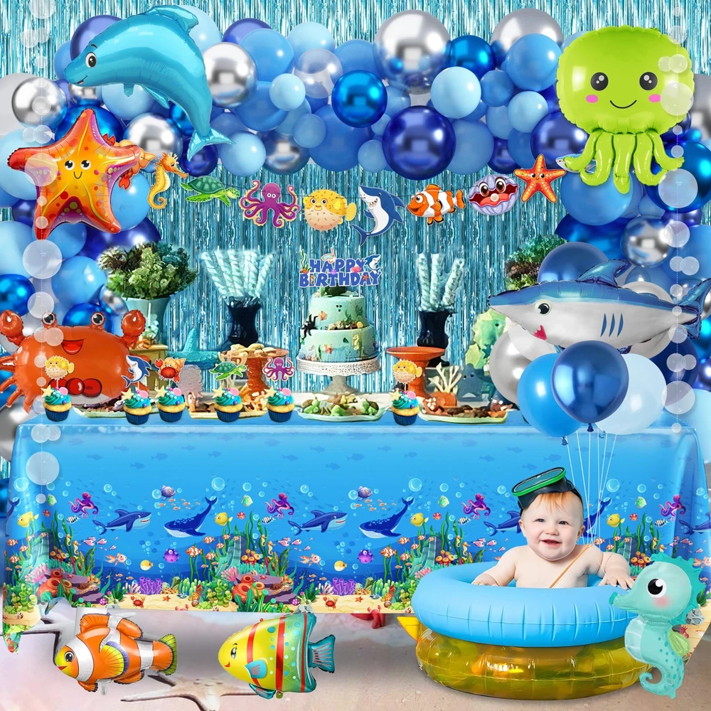 Under the Sea Party Decoration Set -- Ocean blue birthday party decorations include 1 happy birthday backdrop, 1 tablecloth, 1 ocean animal garland, 2 white bubble garlands, 2 foil curtain background, 70 latex balloons, 8 ocean animal foil balloons, 1 cake topper, 12 cupcake toppers, 3 tools kit (balloon chain, glue points, ribbon). Exquisite Design -- The backdrop and tablecloth use underwater world creatures as elements, such as octopus, sharks, whales, turtles, crabs, clown fish, seaweed, coral, etc. The bright colors and vivid watercolor designs add more joyful atmosphere to your party. Reliable Material -- The disposable ocean tablecloth is made of plastic, waterproof and oil-proof, can be thrown away directly after use. The background cloth is made of high quality polyester fiber, strong and reliable, not easy to tear. Natural latex material balloon and high-quality aluminum foil balloon, non-toxic and non-hazardous, not easy to burst. For Any Occasions -- Perfect sea animal party decorations for ocean themed party, shark themed party, mermaid themed party, tropical fish themed party, boys and girls birthday party, also can be used for beach party, pool party, baby showers, summer party decoration, holiday celebration, outdoor picnics and other party decoration. Sincere Customer Service -- We only stock high quality products and strive to offer the highest level of service. If you have any question after purchase, you can contact us at any time, we will solve it as soon as possible. We hope you have a pleasant shopping experience.