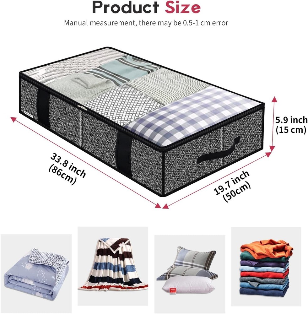 Underbed Fabric Storage Bags Organizer with 4 Handles, 2 Zippers and Large Clear Window, for Clothes, Blankets, Bedding, Foldable with Sturdy Structure, 2 Pack, Linen-like Black, MXAUBBSS2P STORAGE FOR MULTIPURPOSE - This underbed storage bag fits perfectly under your bed. And ideal for storing clothes, comforters, blankets, off season duvets, beddings, pillows, garments, sweaters, and so on. Keep your closet tidy and clean. COMPLETELY BREATHABLE and 100% ECO-FRIENDLY - This storage bag is made of breathable nonwoven fabric that allows air to circulate inside, ultimately keeping stored items fresh for longer, lightweight, eco-friendly. The sturdy side walls with inserts can hold shape without being filled up. CONSIDERATE DESIGN - With the help of top transparent window, you will find what inside easily and quickly. This storage bag has 5# larger metal zippers, they can be used more than 1000 times (more times than others' cheap bags). Dimension: 86x50x15cm( FOUR DURABLE HANDLES - The 2 front handles are 5 cm wide and the 2 side handles are sewn to 2 layer high quality fabric, more durable to carry and pull out from under the bed. You can also fold this storage bag flat to save space when not in use. product: - THE BEST CUSTOMER SERVICE - If for any reason you're not completely happy with your purchase - if it breaks, if it's damaged in shipping, or even if you change your mind - simply let us know and we will either replace it or satisfaction your money, your choice!